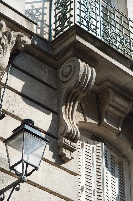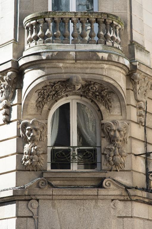 Le pan coupé concentre un décor important au niveau de l'entresol avec des têtes de lions vomissant des fruits placées au-dessous d'un mascaron entouré de fleurs supportant un balcon à balustres en pierre. Le pan coupé est mis en valeur par des pilastres à faux chapiteau corinthien reposant sur des bases de feuilles d'acanthe au niveau des 2è et 3è étages.