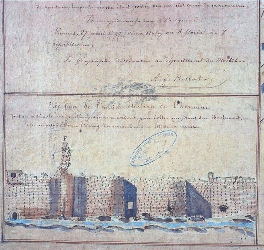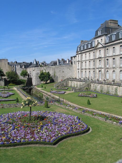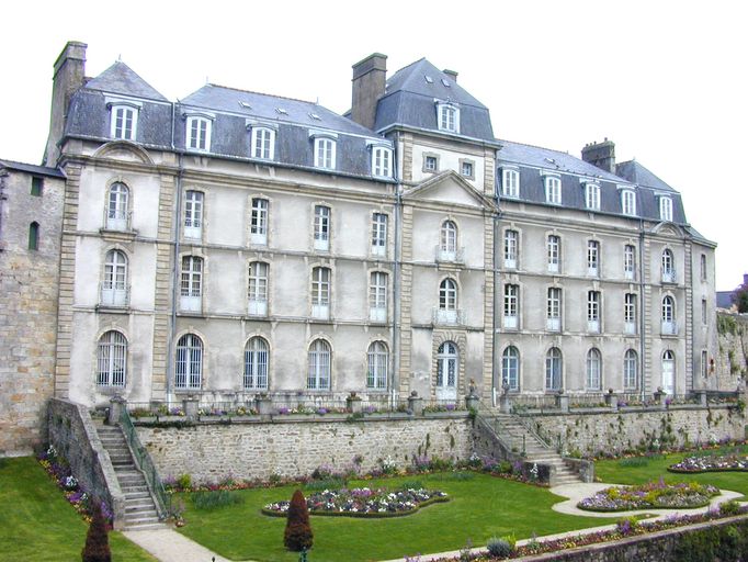 L'édifice actuel est construit sur l'emplacement du château de l'Hermine, ancienne résidence des Ducs de Bretagne, édifiée par Jean IV dans les années 1380 face au parc de la Garenne. Il s'appuyait sur l'enceinte agrandie et comprenait un corps de logis 'avec force petites tours issantes les unes sur le autres ' et 'deux grosses tours par le dehors', ainsi que le décrit Bertrand d'Argentré en 1582.