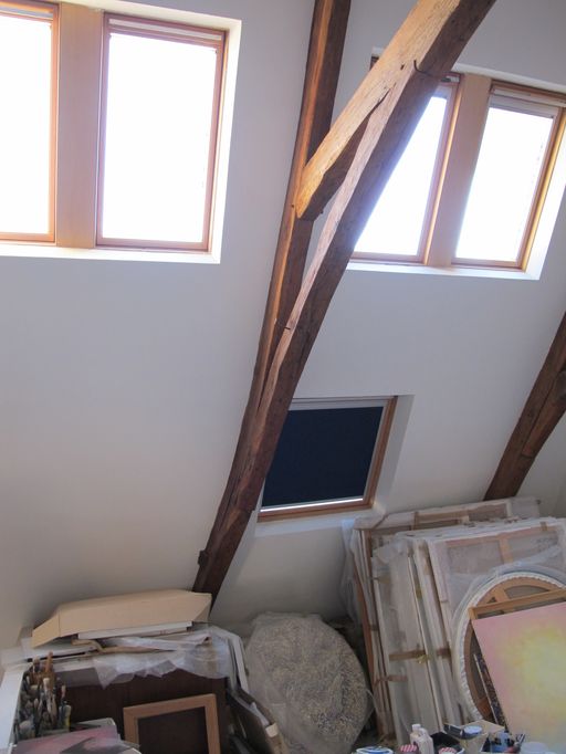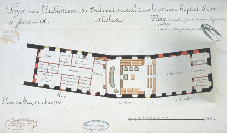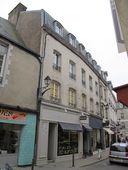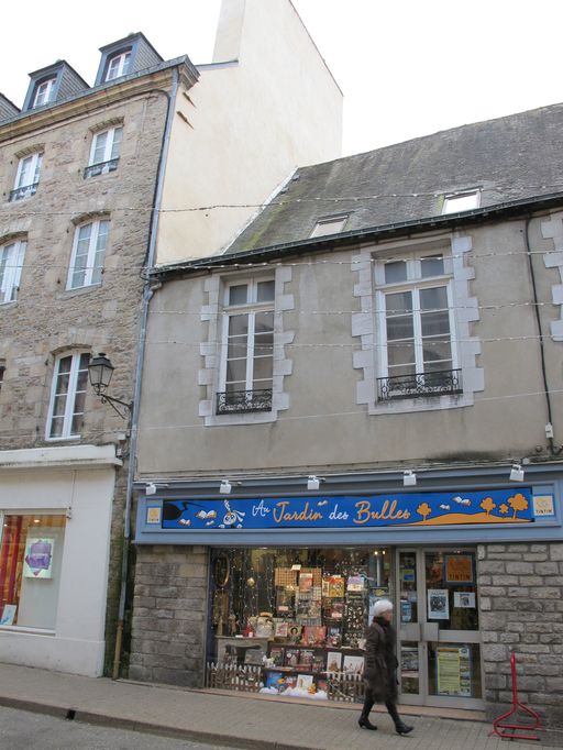 Bordant le versant sud de la rue Saint-Nicolas, l'hôpital médiéval était formé d'une chapelle à l'est prolongée sous le même toit du bâtiment abritant les salles de malades. Ce dernier subsiste en partie : doté d'un étage carré il se composait sans doute d'une salle haute sous charpente, comme en témoigne la charpente autrefois lambrissée qui subsiste ; les fermes qui la composent accusent aujourd'hui une forte déformation probablement consécutive à la destruction de la chapelle en 1802 qui a modifié l'équilibre de la charpente (destruction d'un mur de refends ?). Cette partie sous charpente fut sans doute plafonnée assez rapidement ; en effet, une tour d'escalier postérieure polygonale dont on ne distingue plus que la partie supérieure (IMG 2699, 2736), distribuait l'étage et probablement le comble : elle abrite un escalier en vis très remanié qui aujourd'hui, ne distribue plus que l'aile sud, également très reprise. Le plan ici adopté, chapelle suivi de la salle des malades ouvrant directement sur la chapelle, est une structure fréquente dans les hôpitaux médiévaux et se retrouve encore intacte à l´hôpital Frémeur de Quimperlé.