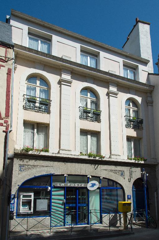 Immeuble bâti en retrait de rue à plan double en profondeur de 3 étages carrés. Il montre une élévation enduite ordonnancée de 3 travées séparées par des pilastres avec arcade unique pour les ouvertures des 2 premiers étages. Porte d'entrée latérale sur un couloir avec escalier tournant à retours sans jour.