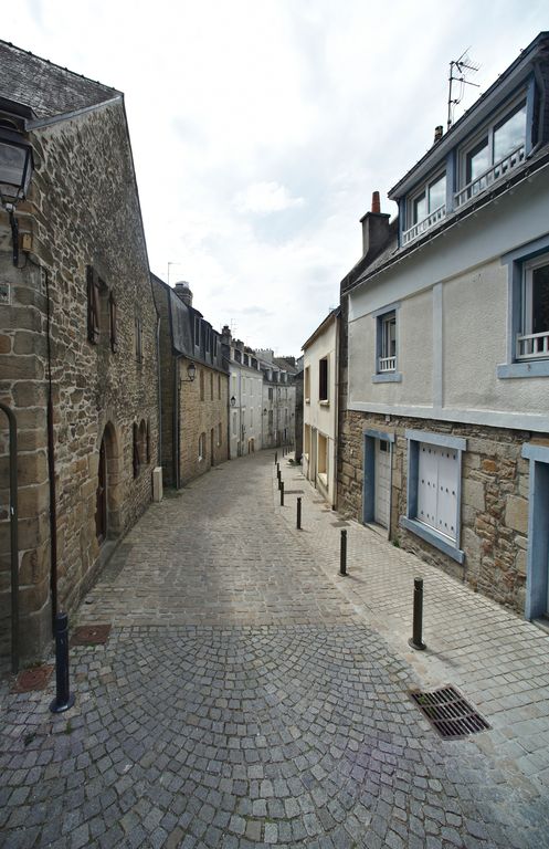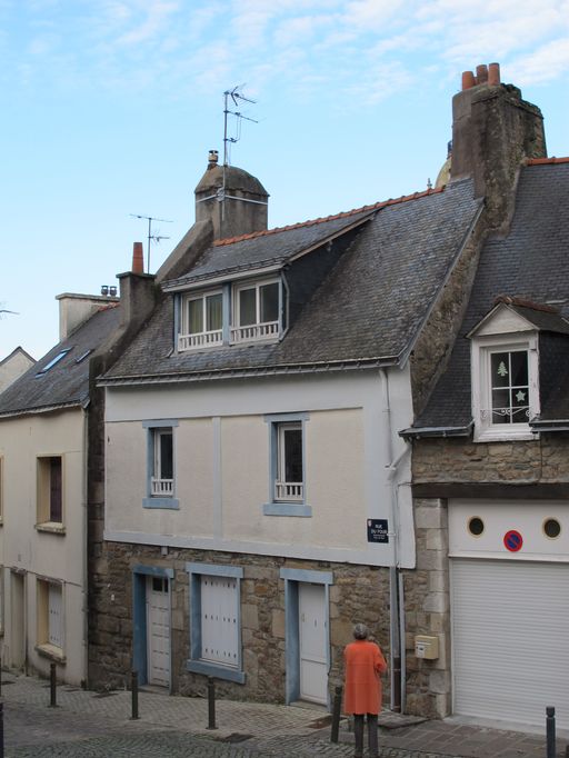 Maison remontant peut-être au 16e siècle figurant sur le plan cadastral de 1807 et de 1844 avec à l'époque un jardin en profondeur sur lequel est construite aujourd'hui une autre maison (fiche suivante). Une grande campagne de transformation intervient dans les années 1940 : la façade sur rue montre des traces de remaniements effectués à cette époque. La maison a conservé un de ses murs latéraux en granite, support d'une façade qui était en pan de bois et dont les abouts de solives subsistants d'un encorbellement d'origine sont encore visibles ; peut-être le pan de bois est-il conservé sous l'enduit 20e. Les encadrements des ouvertures du rez-de-chaussée montrent également l'ancienneté de la maison. A la même époque que la modification de la façade sur rue, on ajoute un corps postérieur en appentis dans lequel se loge aujoud'hui l'escalier.
