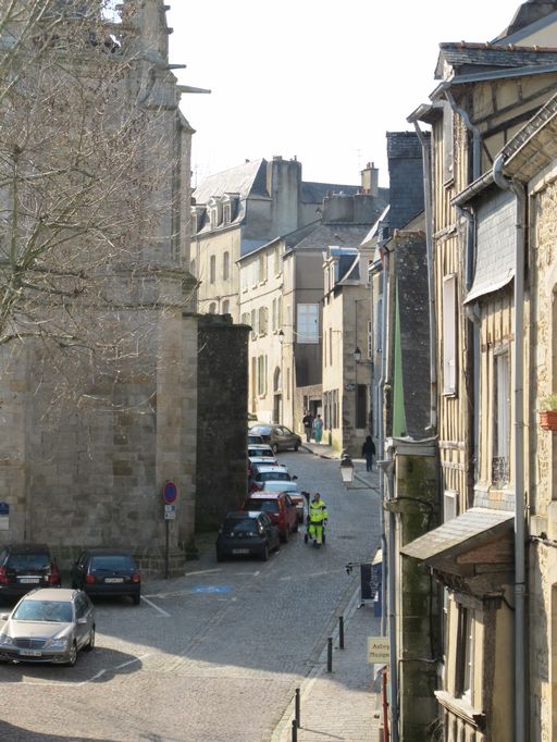 Rue d'origine médiévale, reliant en longeant la cathédrale côté nord, les 2 faubourgs industrieux de la ville, Saint-Salomon et Saint-Patern. Derrière le chevet de la cathédrale se trouvaient des constructions qui ont été détruites par un incendie en 1844. D'où le nom de la place actuelle qui porte le nom de place brûlée en souvenir de cet incendie. De même, disparue aujourd'hui, une fontaine construite sur cette place et visible sur les anciens documents iconographiques.