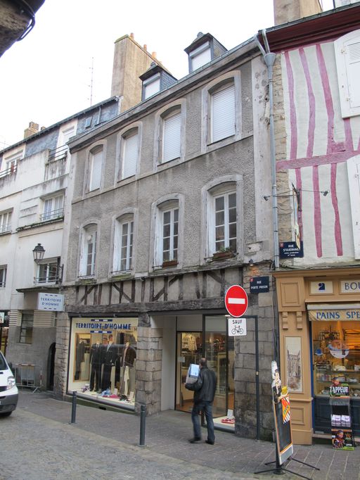 Immeuble en alignement de rue de plan rectangulaire double en profondeur de 2 étages carrés et étage de comble. Immeuble dont la façade sur rue est en pan de bois dissimulé partiellement sous un enduit. Le départ du pan de bois au premier étage est encore visible de même que les départs des murs latéraux. Le soubassement est en pierre de taille de granite. La façade est une façade à pan de bois droite. L'accès aux étages se fait par l'escalier de l'immeuble suivant (n°1 rue Saint-Guénael).
