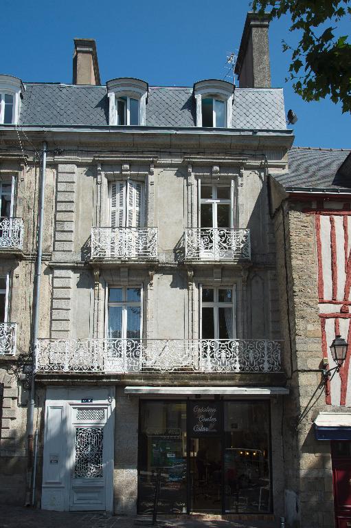 Immeuble construit en 1900 d'après le cadastre numérisé sur l'emplacement d'un édifice et d'une cour latérale visibles sur le cadastre de 1844 et qui correspondent dans les matrices à des magasins et à un pavillon appartenant à la veuve Mail de Rochefort qui était aussi propriétaire sur la parcelle suivante du "Café brûlant". Les augmentations/diminutions des matrices cadastrales de 1844 indiquent pour l'année 1848 la démolition des magasins appartenant alors à Jean-Marie-Dieudonné Guriec par décision du Conseil d'état rendue le 18 mai 1848, et une nouvelle construction pour l'année 1850. D'après les archives, cette dernière construction sera très vite remplacée par l'immeuble actuel construit en 1880 pour Hyppolite Morcrette, dit négociant, suivant les plans de l'entreprise Normand frères. Hyppolite Morcrette est aussi le commanditaire de l'immeuble voisin. L'annuaire du Morbihan pour 1885 indique Morcrette comme mercier.
