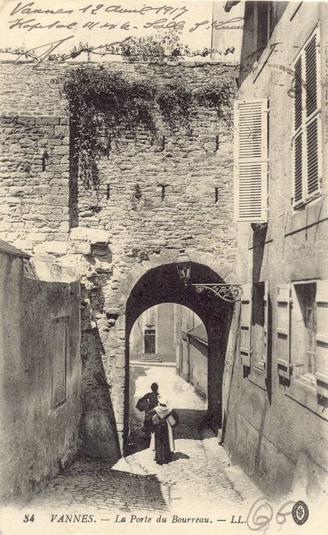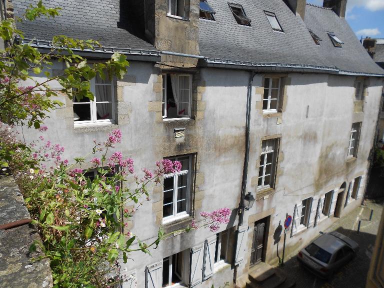 Occupation ancienne du lieu par les religieux de l'abbaye de Notre-Dame de Prières de l´ordre de Citeaux située à Billiers qui possèdent cet ensemble de deux maisons dans le rentier ducal en 1455-1458 et dans la déclaration et le dénombrement de 1677 ; avant cette date, ils n'en sont pas encore les propriétaires puisque les maisons sont dites appartenir avant 1455 à Muillour et Coupe Gorge pour la première (celle qui joint le mur de la ville) et à Jehan Campsquel pour la seconde. Ce qui permet d'expliquer la partition en deux logis de l'ensemble actuel, séparés par un mur de refends, bien qu'il est probable que ces logis aient été reconstruits au 16e siècle pour l'abbaye avec un corps en retour sur la maison sud et deux tours d'escalier, celle du sud desservant peut-être les deux maisons. Les corps sur rue sont bien individualisés au niveau des toitures de hauteur différente. Le rentier mentionne également l'existence de 2 places jointives de ces maisons mais qui restent cependant difficiles à situer. Sans doute correspondent-elles aux jardins postérieurs.