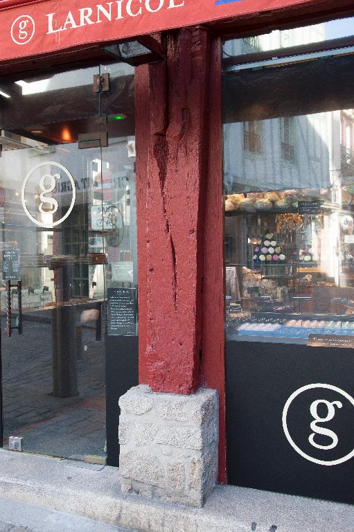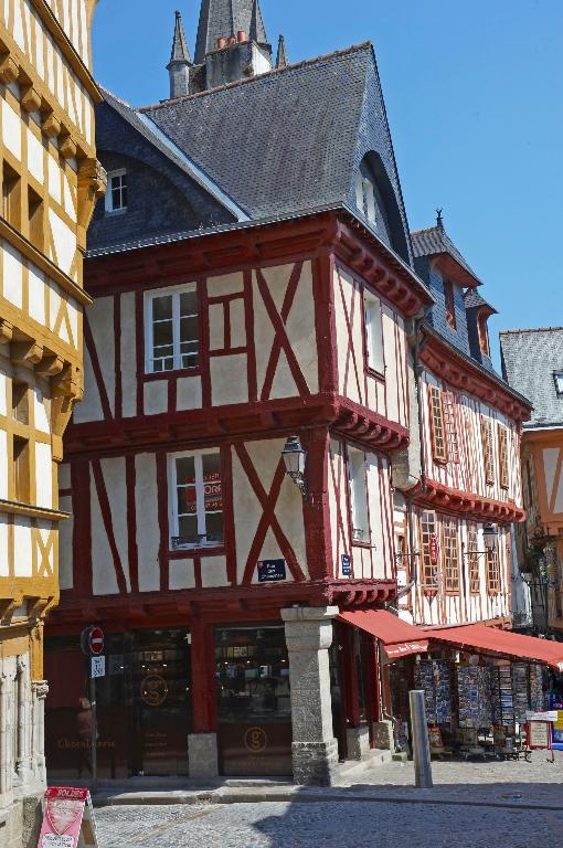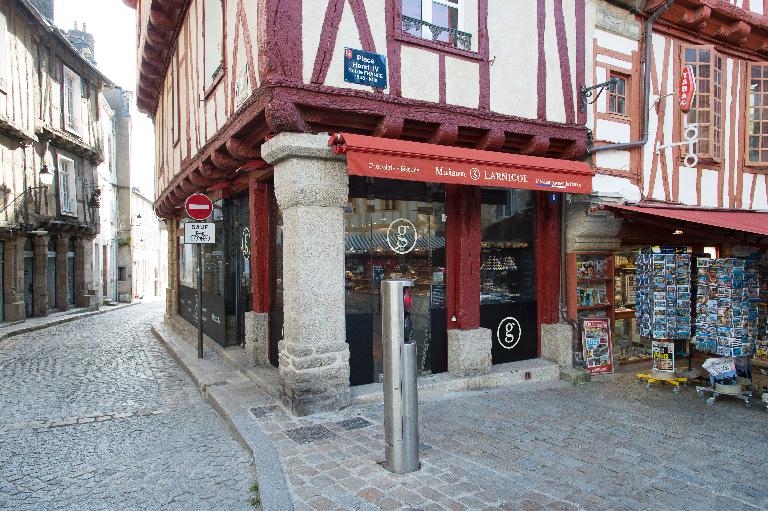 Maison en pan de bois établie sur une parcelle d'angle de type "laniéré" dans sa totalité. Maison construite sur un sous-sol, qui montre 2 étages carrés en encorbellement, surmonté d'un étage de comble. Avec l'existence d'une pile d'angle granit, le soubassement de la maison est composé de poteaux de forte section en bois reposant sur des dais de pierre. La toiture de la maison est à deux pignons, un sur chaque rue qui se croisent à angle droit. Croix de Saint-André utilisées en type de décharge, de sablière à sablière, entretoises superposées pour l'encorbellement composent la charpente de la façade.