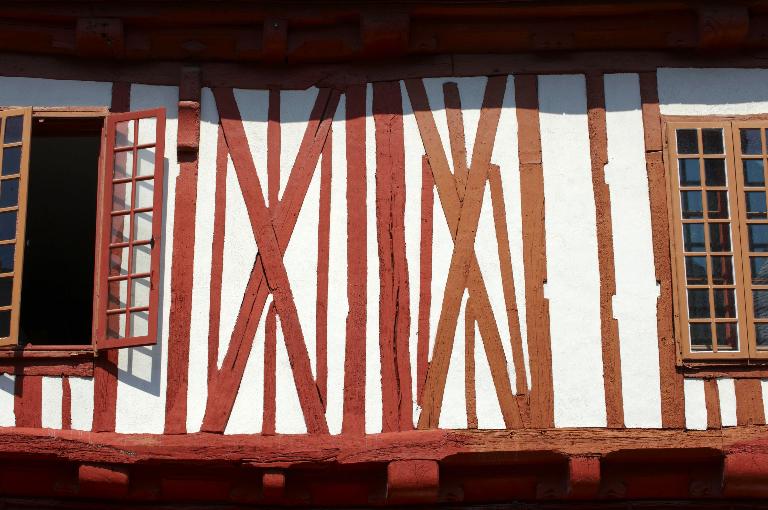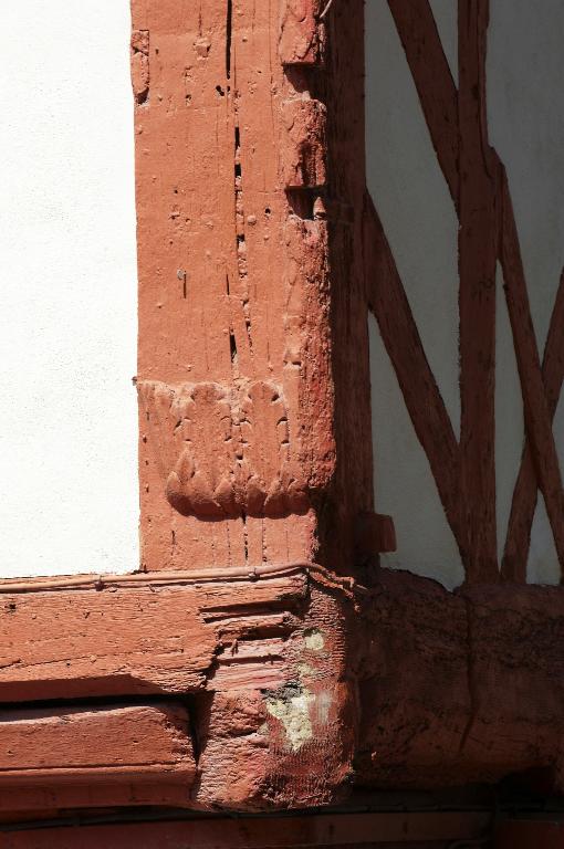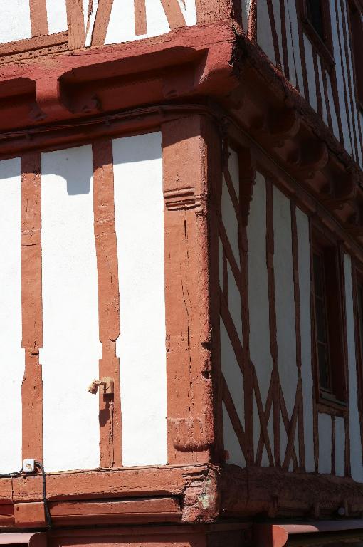 Maison de taille importante établie sur une parcelle large et d'angle entre la place Henri IV et la place Saint-Pierre. Maison à plan double en profondeur construite sur un soubassement maçonné et dont 2 façades sont en pan de bois. Elle comprend 2 étages carrés en encorbellement et un étage de comble sous une toiture à longs pans. cet étage de comble montre une importante lucarne qui rend cet étage habitable. Le raidissement de la façade est opéré avec des croix de Saint-André aux angles et sur toute la hauteur de l'étage ainsi que des bois disposés en brins de fougère. Les entretoises sont différemment sculptées.