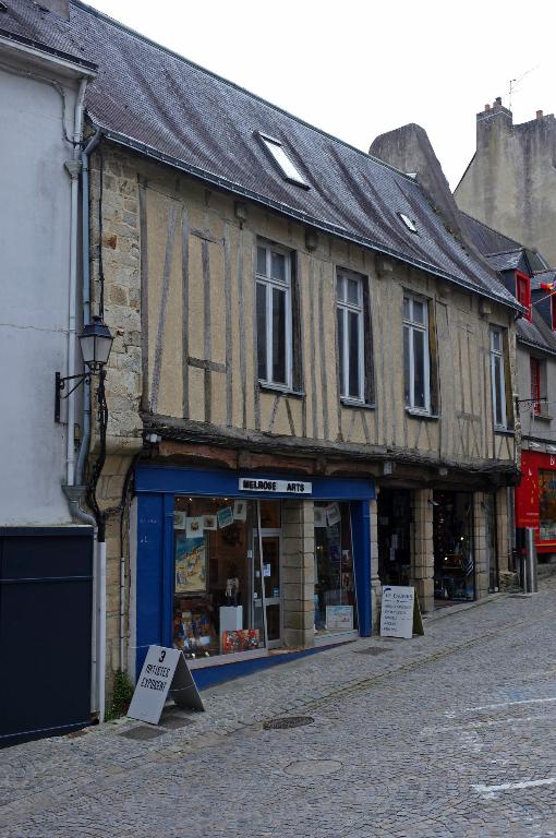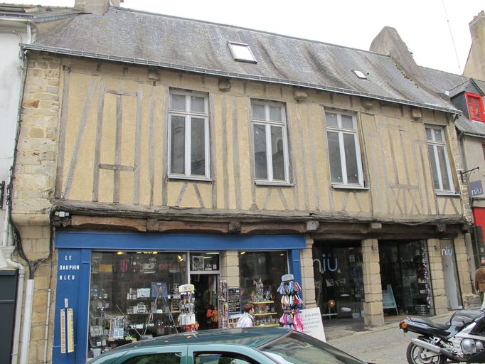 Le rez-de chaussée est structuré en 6 travées de taille inégale (la travée ouest plus étroite), les abouts de poutres correspondant systématiquement aux piles ornées de pilastres, reprise en sous-oeuvre, qui structurent la façade ; la sablière de chambrée en partie moulurée d'un cavet et assemblée en trait de Jupiter montre encore des traces de peinture. Les abouts de poutres ont été abimés lors de la fixation de l'ancienne devanture en bois (carte postale ancienne). Il faut remarquer la hauteur de l'étage en pan de bois : c'est en effet un des rares cas de maisons vannetaises en pan de bois à gouttereau sur rue où l'étage n'a pas été affecté par un recoupement, visible en façade, destiné à créer un étage en surcroît supplémentaire ; sur les ouvertures des 6 travées, datant toutes de la campagne du 17e siècle, deux fenêtres ont été bouchées ; on distingue cependant sous la fenêtre bouchée à l'ouest, deux croix de saint-André qui pourrait témoigner de la place et de la taille des fenêtres initiales. Les fenêtres ont été agrandies vers le haut : leurs linteaux montrent sur leur face interne une deux mortaises, traces des poteaux intermédiaires les reliant au linteau disparu.