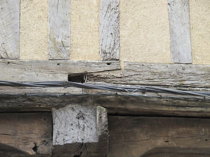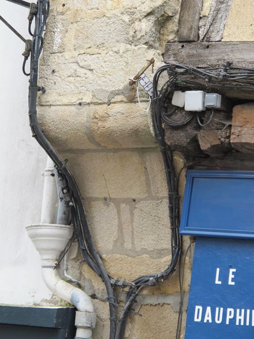 Le pignon ouest à encorbellement en pierre de taille est contemporain de la construction, tandis qu'à l'ouest, l'about de pignon, en moellon et sans encorbellement mouluré est peut-être le pignon de la maison voisine (reconstruite vers 1950).