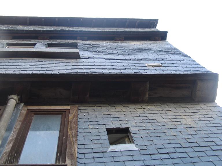 Maison mitoyenne à pan de bois en encorbellement à double façade construite sur une parcelle traversante. La façade arrière également en pan de bois est essentée d'ardoises et borde la venelle côté sud. La maison est construite sur un sous-sol avec poutres au plafond et arcade en pierre supportant la vitrine de la boutique. Présence de soupiraux de chaque côté et d'une armoire murale mur est. La maison est de 2 étages carrés sur un soubassement de pierres avec étage de comble et avec conduit de cheminée dans le mur est. Seule celle du premier étage est apparente. On note mur est une porte d'accès aujourd'hui bouchée vers la maison précédente. L'escalier est latéral postérieur, à retours sans jour en bois.