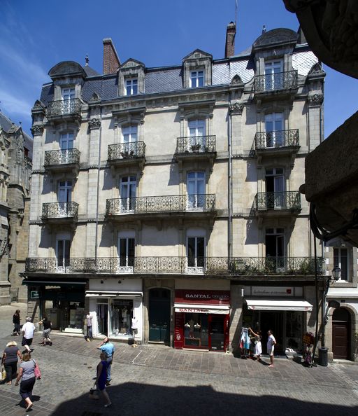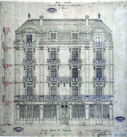 AM Vannes fonds Fraboulet. Immeuble Bardet, façades rue de la Monnaie et place Saint-Pierre par Mathurin Fraboulet, Nantes, 21 juillet 1880.