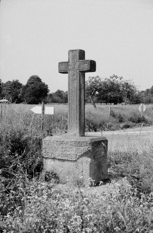 Croix de chemin en granite sur socle et emmarchement ; fût de section rectangulaire.