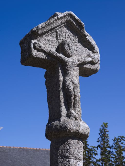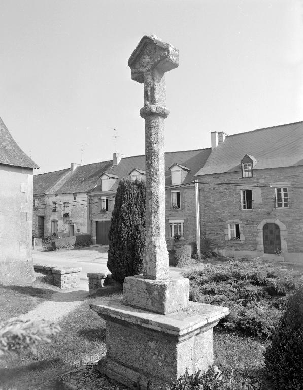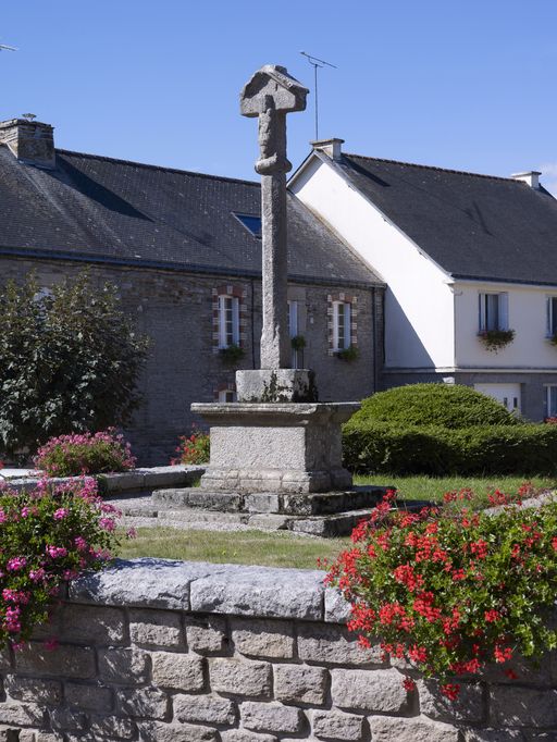 Croix monolithe à bâtière sur socle et soubassement en pierre de taille de granite ; fût de section carrée chanfreiné à griffes. Décor en haut-relief ; sur une face : Christ en croix ; sur l'autre face : Vierge à l'Enfant.