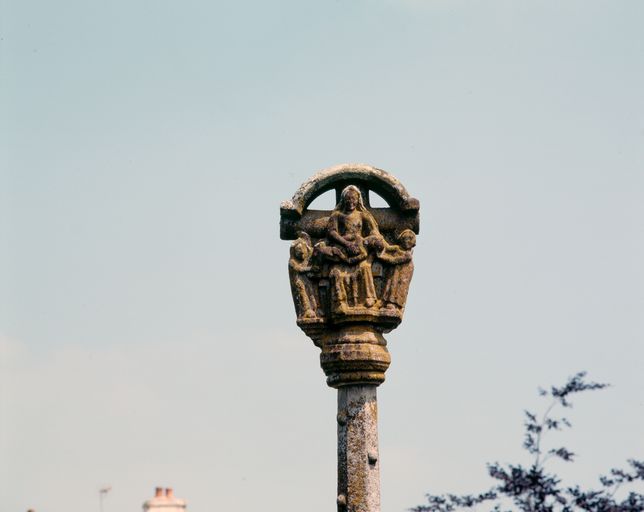 Croix à bâtière à tableau sur socle et soubassement de pierre de taille ; fût de section carrée chanfreiné et écoté. Décor en ronde bosse ; sur une face : Calvaire ; sur l'autre face : Vierge de pitié.