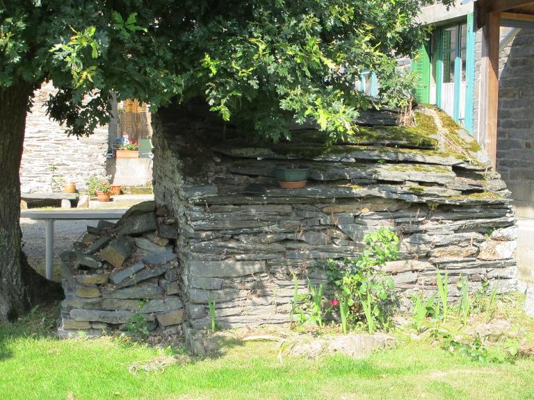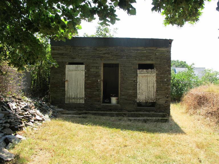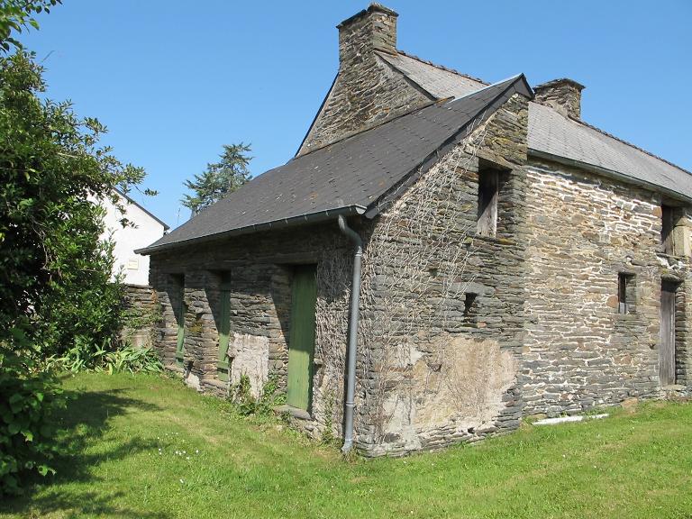 Ancien logis-étable à deux portes, orienté est-ouest ; murs en moellons de schiste, linteaux de bois, appuis des fenêtres en plaque de schiste ; au-dessus de la fenêtre du logis grande croix en enduit ; cheminée en bois ; ajout d’une nouvelle étable dans les mêmes matériaux, à une date indéterminée du 19e siècle, puis d’une soue à trois loges, perpendiculaire à la seconde étable ; dans la cour, puits couvert en dalles de schiste.