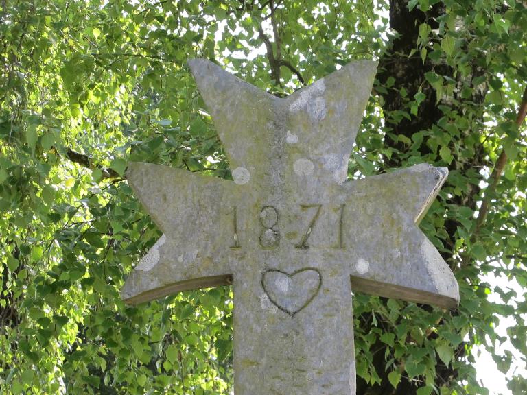 Croix palis sur soubassement rectangulaire maçonné couvert d'une dalle de schiste ; fût de section rectangulaire à empattement ; branches échancrées ; à la croisée, cœur gravé surmonté de la date 1871 .