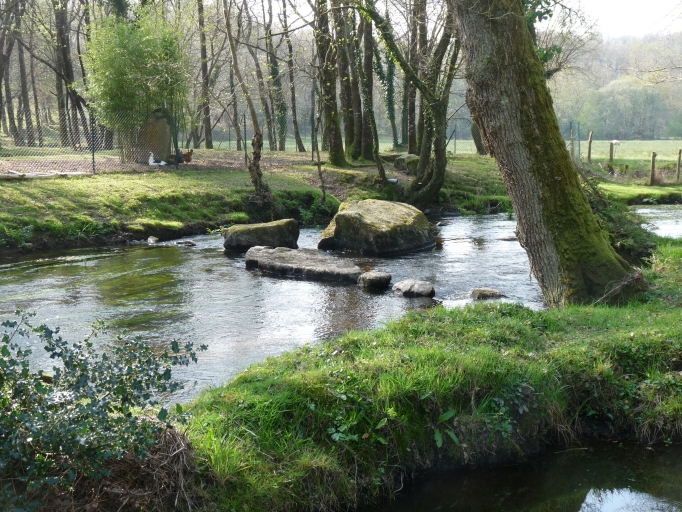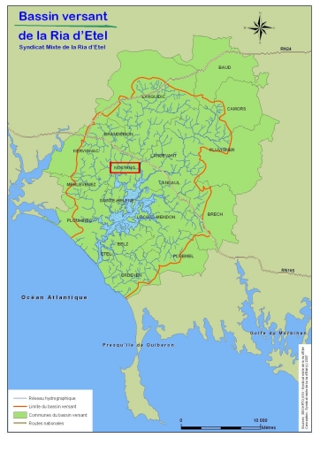 Le sous-sol est principalement de constitution granitique et le réseau hydrographique est dense (fig. 11 à 13). En effet, le territoire communal est entouré d'étangs naturels et artificiels et trois ruisseaux le parcourent : le ruisseau du Moulin du Palais, le ruisseau de Saint-Georges et celui du Pont du Roc'h (fig. 14) qui traverse la commune et qui prend naissance non loin de la forêt de Camors.
