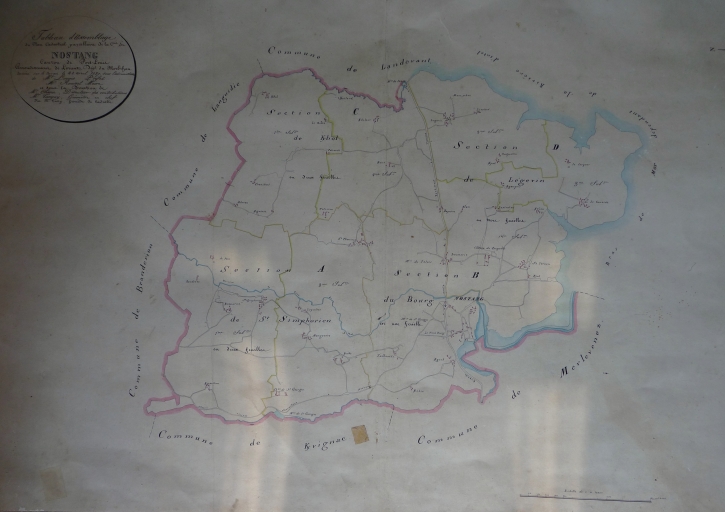 On notera la présence, au Vieux -Bourg, d'une dalle de pierre aux contours moulurés et ornée de deux lions tenant les armoiries de la famille Botdéru : d'azur au chevron d'or, accompagné de trois billettes d'or (fig. 31), aujourd'hui incluse dans la maçonnerie d'un muret d'une ancienne ferme. Les armoiries de cette famille, originaire de Plumelin et Carnac, citée dès 1427 dans les montres et réformations du domaine ducal, sont visibles dans le lobe supérieur du vitrail de la baie axiale de la chapelle de Locmaria. Les seigneurs influents n'étaient donc pas systématiquement localisés à Nostang mais aussi dans les communes voisines