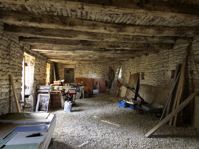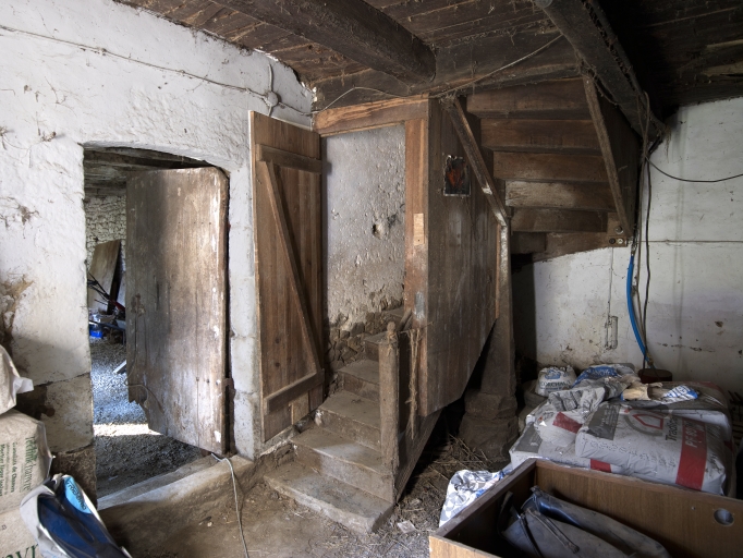 L'étable montre également une distribution originale : dotée de deux portes, elle est divisée par un refends au rez-de-chaussée qui ménage dans la partie est un espace habitable secondaire, chauffée et doté d'un 3e évier, sans doute la pièce des parents âgés ou d'une famille de domestiques. De cette pièce part l'escalier en bois qui dessert le vaste grenier de l'étable et le faux-étage et greniers au-dessus de la salle ouest du logis (Une information orale affirme qu'il y avait trois étages de grenier).