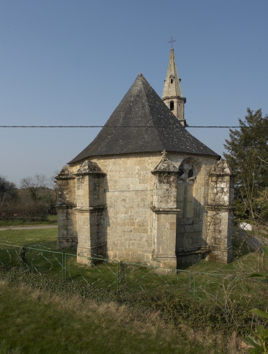 Si le plan à vaisseau unique prédomine dans les chapelles de petites dimensions, on rencontre d´autres structures. Ainsi le plan en croix latine, adopté à Locmaria-er-Hoët (Landévant), mais aussi à la très belle chapelle Notre-Dame de Mendon datée 1474, commanditée par les Rohan et le duc François II : Malgré la reconstruction de sa nef en 1875 suite sa transformation en église paroissiale au 18e siècle, la chapelle en pierre de taille de plan en croix latine conserve des éléments de grande qualité, tel le porche sud à apôtres (fig.16) et la fenêtre du chœur. Ce plan est aussi employé dans les chapelles Saint-Laurent et Notre-Dame de Pitié (Kervignac), disparues pendant et après guerre. Cette dernière datée 1553 était la plus imposante (avec celle de Mendon) des chapelles gothiques du secteur avec sa puissante tour occidentale (doc.2) inspirée de celle Notre-Dame du Paradis à Hennebont, construite vers 1525. La chapelle de Locadour (Kervignac) montre un plan inhabituel, une très longue chapelle nord perpendiculaire à la nef dans l´axe du chœur. Les chevets sont plats, à l´exception des chœurs polygonaux de deux chapelles du 16e siècle, à Langroez (bourg d´Erdeven) ainsi qu´à Légevin (Nostang), fig. 17.