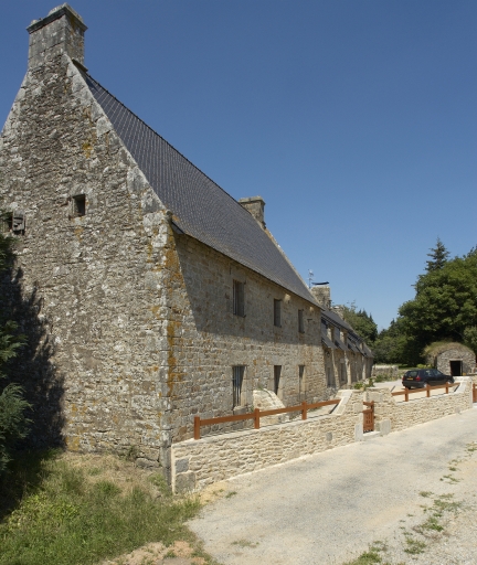 La ferme orientée au sud se compose de deux corps en alignement. Le premier à l'est était un logis-étable : on identifie la salle à l'est avec cheminée en pignon, placard muraux à étagère de granite, l'un à gauche de la cheminée, le second dans le mur sud près de la fenêtre datée. La cheminée est constituée de piédroits chanfreinés à demi-colonnettes, de consoles en quart-de-rond de granite et d'un linteau de bois. Le nouveau logis est construit en pierre de taille. Sa distribution, symétrique par rapport à l'axe, se compose de deux pièces chauffées en rez-de-chaussée, séparées par un couloir limité par des cloisons de bois, dallé de granite, où se trouve l'escalier en bois qui dessert le faux-étage (en fait un premier grenier, suivi d'un second niveau de grenier dans le comble). L'escalier est à retours en bois, les cheminées, en partie masquées par des boiseries, identiques à chaque pignon, à linteau de bois et consoles en granite en quart-de-rond. La salle occupe la pièce de l'est, comme en témoigne l'évier mural à deux étagères de bois ménagé dans le mur sud. La crossette du rampant sud-est est ornée d'une tête humaine. Contre la façade sud du nouveau logis est adossée une niche à chien en pierre couverte en appentis. Au sud du logis, la loge à cochon en moellon est ouverte en pignon d'une unique porte à linteau droit. Sa couverture en herbe recouvre une voûte en granite en tas de charge.