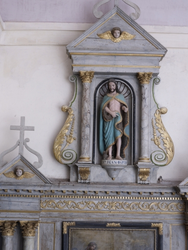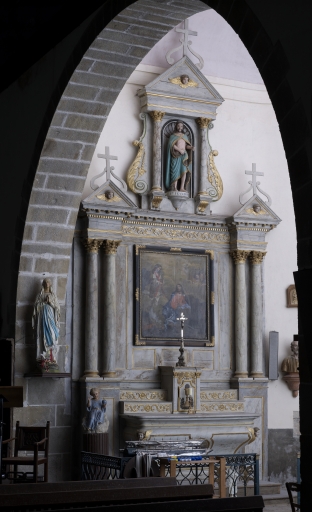 Les bras du transept accueillent deux retables. Le plus ancien et certainement contemporain du retable axial, se situe au nord (fig. 31). Il se compose d'un tableau central encadré de colonnes jumelées qui soutiennent un petit fronton triangulaire. La partie supérieure est constituée d'une niche flanquée de colonnes et de feuillages, accueillant la statue de la Trinité (fig. 32), le tout coiffé d'un fronton triangulaire interrompu. Cet autel est dédié à la Vierge du Rosaire et le panneau central semble représenter la donation du rosaire à saint Dominique (fig. 33 et 34). Le retable sud (fig. 35 et 36) connaît la même organisation bien que celui-ci soit contemporain des trois autels. Il est dédié à la Croix, saint Jean-Baptiste (fig. 37) et au Sacré Cœur, comme en témoigne la statuaire. Le tableau illustre l'agonie de Jésus et sur l'autel du retable, est posé un buste-reliquaire de saint Pierre.