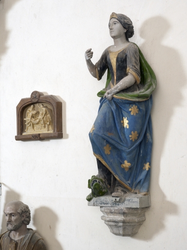 On notera la présence d'une statuaire particulièrement intéressante : deux Trinités, l'une représentée avec le Père assis, l'autre avec la représentation du saint Esprit sous la forme d'une colombe et une statue de la sainte Vierge et de sainte Marguerite datant du 18e siècle (fig. 38 et 39), dont la facture est semblable à celle des proues de bateaux. Cette influence peut s'expliquer par la proximité à cette époque, d'un chantier naval entre Port-Louis et Lorient, pour le développement de la Compagnie des Indes.