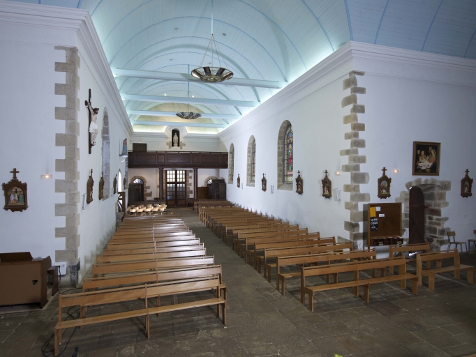 La première église remontait au 15e siècle selon Ogée : une inscription tronquée remployée dans le mur sud mentionne : Lan Mil Quatre Cents quatre (vingt ?). Cette date de la fin du 15e siècle peut être reliée à celle de 1512 incrite sur une sablière déposée que Rosenzweig a vu chez l'aubergiste Couppé : on apprend que le clocher fut achevé en 1512 par François Lorans. Les autres dates mentionnées par Rosenzweig et Du Halgouet figurant en remploi, 1422 et 1413, n'ont pas été retrouvées. Le Méné atteste que l'ancienne église possédait trois nefs, le collatéral nord, seul pavé dédié à saint Martin ; la nef était plus courte que les bas-côtés. La corniche extérieure était sculptée des sept péchés capitaux : peut-être les sculptures fantastiques insérées en remploi dans l'édifice actuelen sont-elles des vestiges. La nouvelle église est érigée en 1834 selon la date portée sur le pignon du chevet. Le devis de construction établi le 30 décembre 1833 se monte à 15000 francs. Il ne comprenait pas le clocher pour lequel un nouveau devis de 14000 francs fut établi en 1842. Faute de subsides, celui-ci n'aboutit pas et un nouveau plan dressé par l'ingénieur-voyer Louis Marsille en 1854 est effectué en 1855 par l'entrepreneur Léon. La sacristie est contemporaine de l'église. Le terrain en pente a cependant obligé à la construction d'un contrefort au nord, près du clocher peut-être à la fin du 19e siècle. Le porche sud détruit pendant la deuxième Guerre mondiale a été reconstruit vers 1950. Sur un soubassement daté 1812 et redaté 1872 peut-être déplacé après la reconstruction de l'église, une croix de bois est érigée 1920, date portée sur le socle. En pendant, on construit le monument aux morts à peu près à la même date.