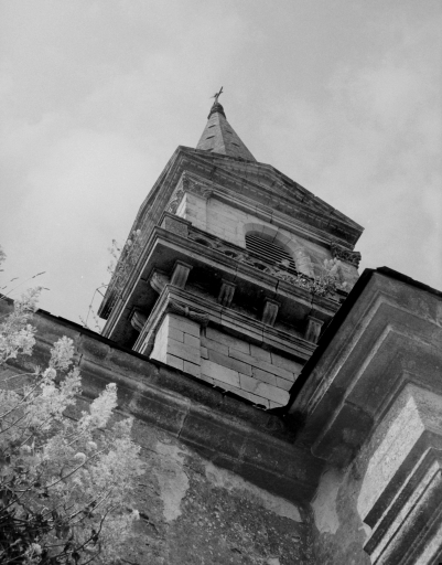 Edifice homogène, l'église est construite en moellon enduit suivant un plan en croix latine. Le massif occidental en léger ressaut sur la nef est construit en pierre de taille pour l'élévation ouest qui contraste par une forte structuration avec l'austérité des autres façades de l'édifice. Dans cette élévation à trois travées, la travée centrale est soulignée par un fronton triangulaire surmontant la porte en plein cintre encadrée de pilastres, une disposition que l'on retrouve sur les quatre faces de la base du clocher. Les vaisseaux sont couverts d'une charpente en berceau lambrissé ; les entraits apparents dans la nef masquent en fait des tirants en fer vus par Danigo en 1983. De nombreuses sculptures sont remployées de l'ancienne église : sur le chevet au dessus de la date de 1834 protégée par un larmier deux blasons ronds aujourd'hui lisses en alliance dans une couronne d'ordre ; sur les rampants du chevet, les vestiges d'un animal (marin ?) non identifié. Une sacristie d'axe en rez-de-chaussée est acolée au chevet.