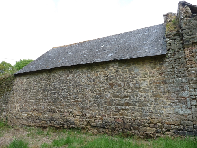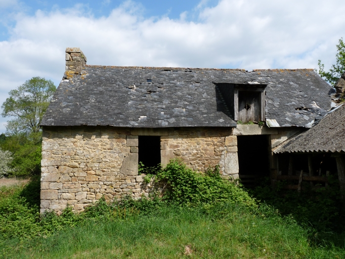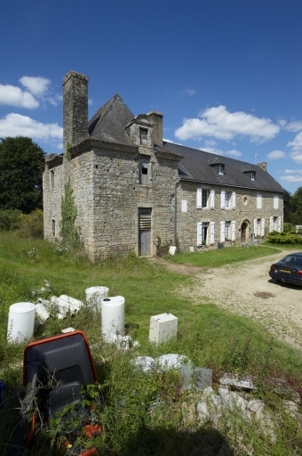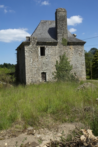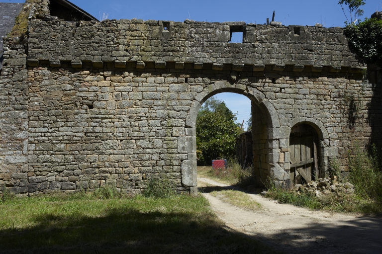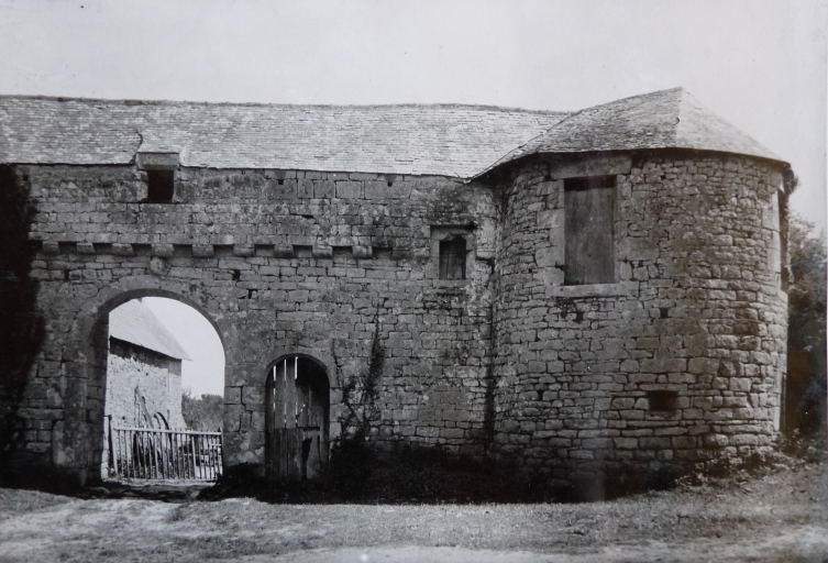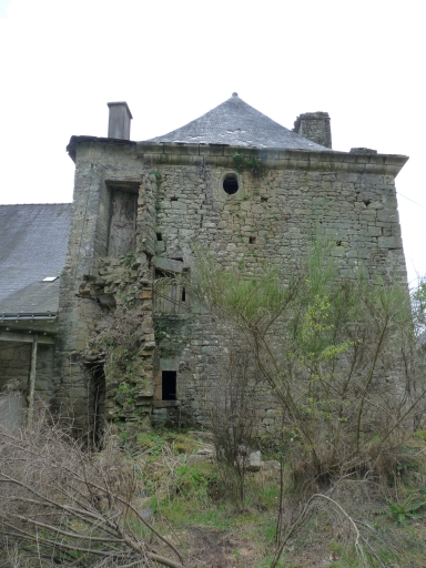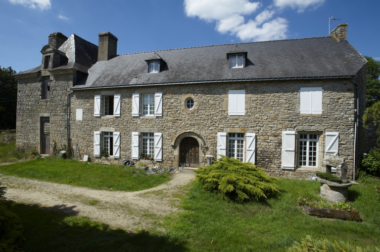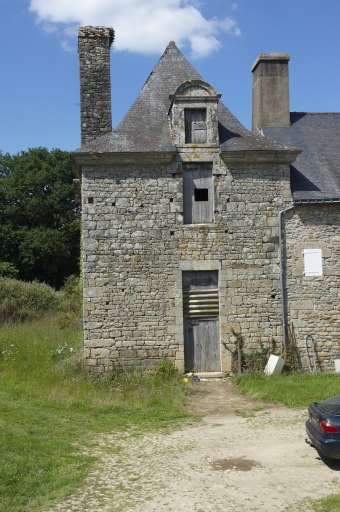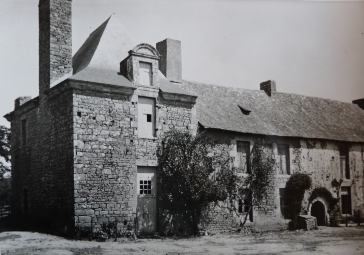 Le logis est constitué de deux corps de bâtiment alignés. Le premiert à trois niveaux (doc. 4, fig. 15 et 16) : rez-de-chaussée, étage carré comble, est construit en moellon de granite et couvert d'un toit à longs pans en ardoise. La façade antérieure est percée au centre d'une porte en plein cintre surmontée d'une archivolte. Sur l'un des claveaux, on peut lire l'inscription suivante : 1764 I.R. Cette date correspond à la reprise de la façade où la porte est remployée ainsi que la fenêtre de droite. De part et d'autre de la porte, deux travées de baies éclairent les différents niveaux. L'une, au rez-de-chaussée, dont les ébrasements sont à ressauts, est surmontée d'un linteau à double accolade moulurée. Il existait à l'étage une échauguette (fig. 17) sur l'angle sud-ouest du logis : sa base et le jour qui l'éclairait sont encore visibles dans le pavillon.