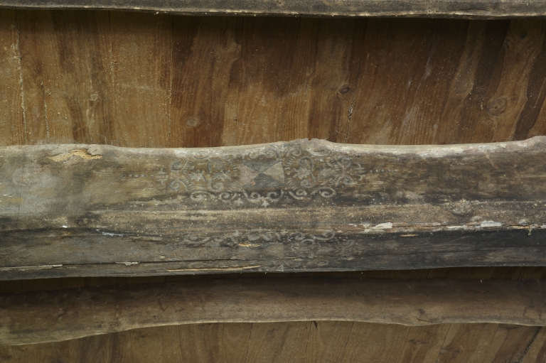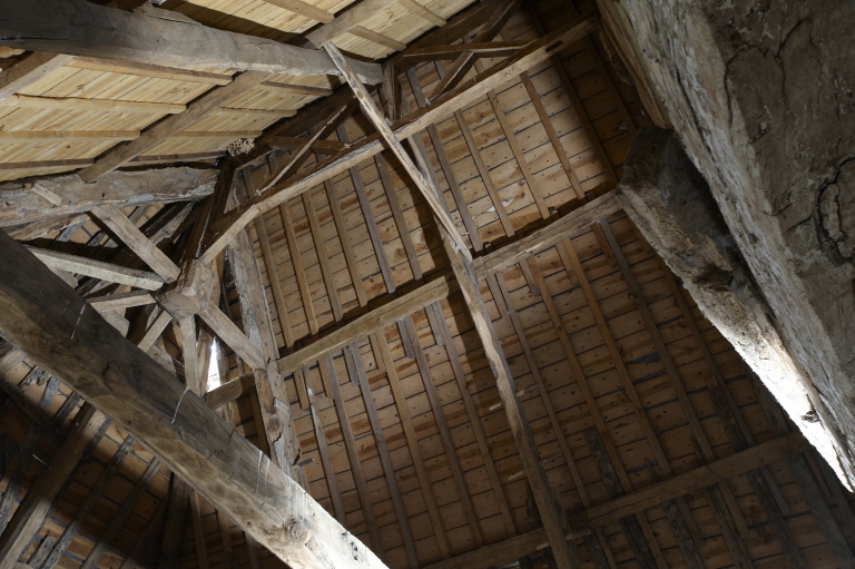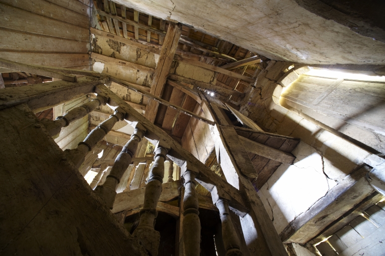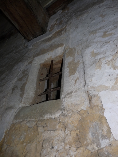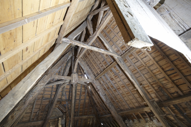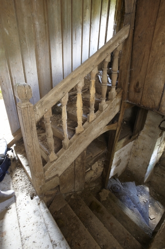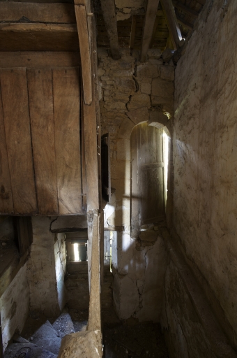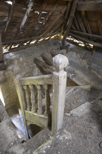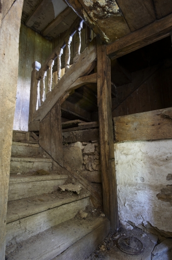 Un escalier dessert les différents niveaux (fig. 26 à 28). Durant la montée de la première volée de marche, on peut voir une fenêtre chanfreinée appartenant au mur ouest du corps de logis (fig. 29), ainsi que les portes en plein cintre (17e siècle) qui menait à la tour d'escalier (fig. 30). A l'étage du pavillon, se trouve la chambre (fig. 31), pourvue d'une cheminée à piédroits très fin (remploi du 16e siècle), ainsi qu'une garde-robe. L'étage de comble est doté d'une charpente en croix de saint André (fig. 32 à 34).