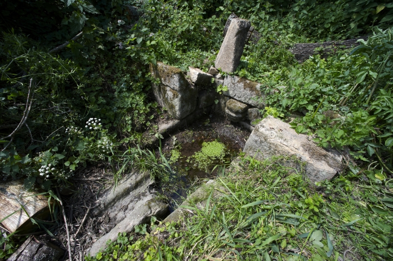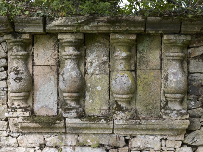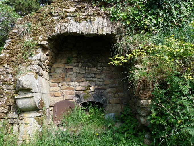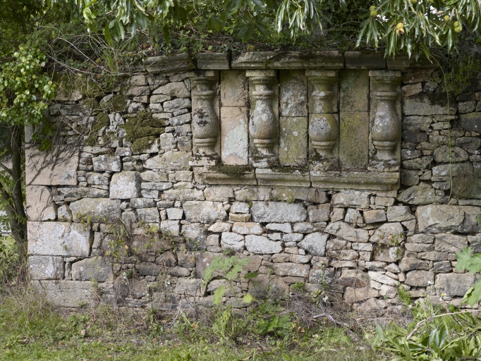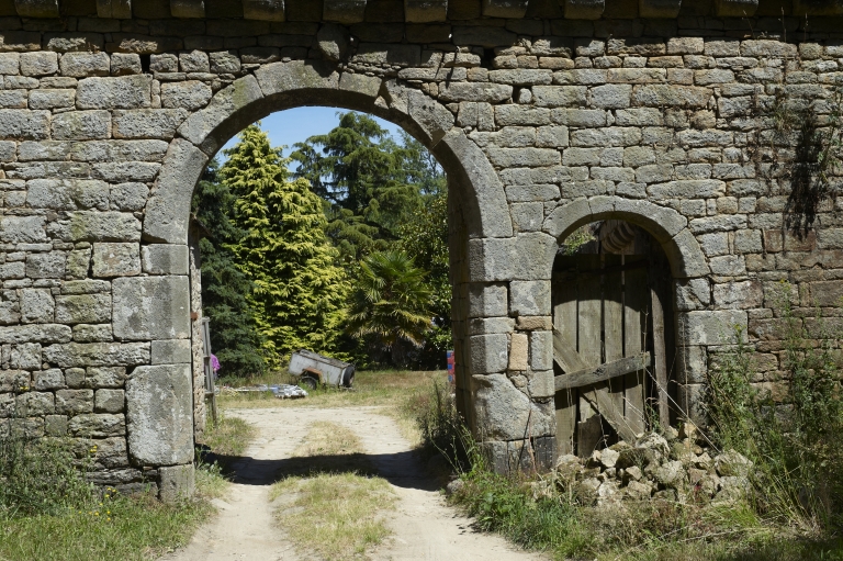 Il existe sur le domaine les vestiges d'une ancienne fontaine (fig. 35). Au sud du grand logis la cour est fermée par le fournil aujourd'hui en ruine (fig. 36). Au sud se développe un grand jardin enclos de mur en partie ruiné, à l'angle sud-ouest duquel, se dresse un petit pavillon de jardin en moellon et pierre de taille de granit, de plan carré. Il possède sur deux de ses façades, une balustrade avec balustres carrés en poire (doc. 5 et fig. 37). Deux fermes : l'une datant du 16e siècle (remaniée), au sud, l'autre de la 2eme moitié du 19e siècle (fig. 39), au sud-est, dépendaient jadis du château. Un four de village situé devant le mur d'enceinte à l'ouest à été conservé.