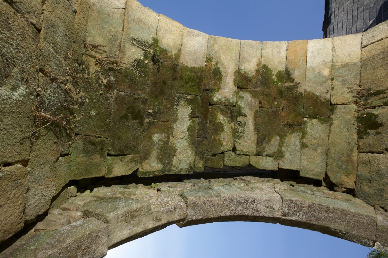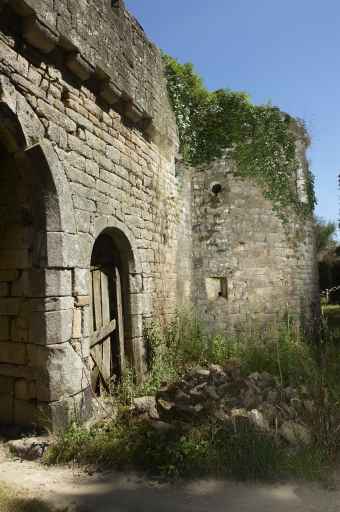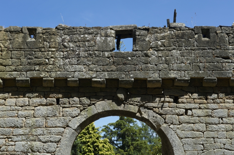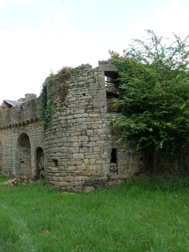 Le château est protégé par un mur d'enceinte, dont il ne reste aujourd'hui qu'une partie, côté ouest. Ce vestige est pourvu d'un système défensif (doc. 2, fig.1 à 4) : tour demi hors-oeuvre, dotée d'ouvertures pour canonnière et mousquet (fig. 5), portail d'entrée, avec portes charretière et piétonne chanfreinées et en plein cintre, côté route et en arc segmentaire, côté cour (fig. 6). L'ensemble est surmonté d'un chemin de ronde en encorbellement, soutenu par des corbeaux et couvert, à l'origine (doc. 2, 3, fig. 1 et 7). Une herse, aujourd'hui disparue, protégeait l'accès au château, l'espace prévu pour son passage est encore visible au dessus de la porte charretière (fig. 8 et 9). Adossée au mur d'enceinte, côté cour, en retour de l'ouvrage d'entrée, se trouve la chapelle couverte en appentis (doc. 3 et fig. 10 à 12), au mur nord percé d'une porte et d'une baie chanfreinées et en plein cintre et terminé par une corniche à modillons, tandis qu'une seconde porte est percée dans le mur sud. L'édifice communique avec la tour par une porte. Au nord du portail d'entrée, existe une dépendance couverte d'un toit à croupes brisées (doc. 3), dont le mur gouttereau ouest est constitué par le mur d'enceinte (fig. 13). Il est percé d'une porte et d'ouvertures, dont l'une, surmontée d'un fronton triangulaire, éclaire l'étage.