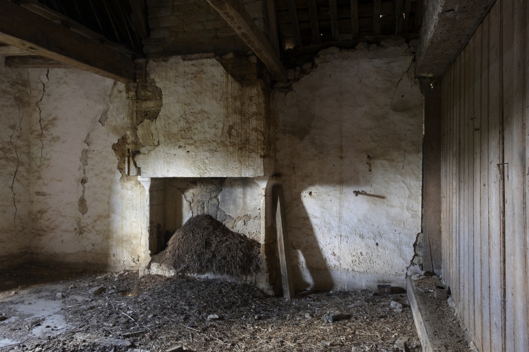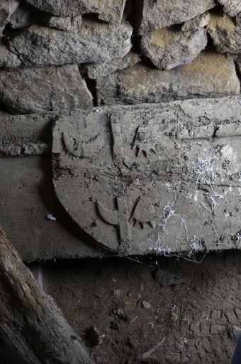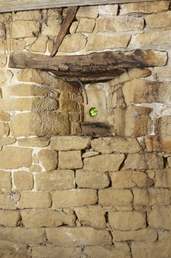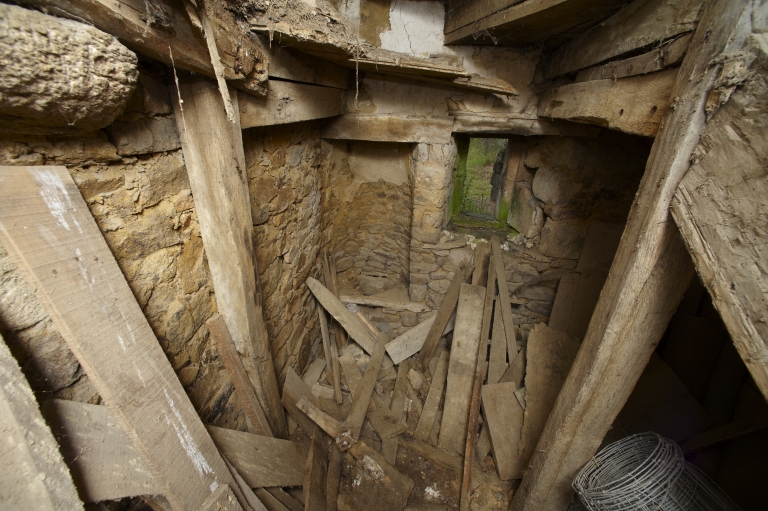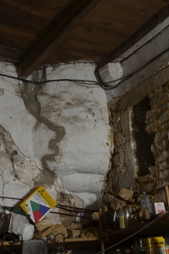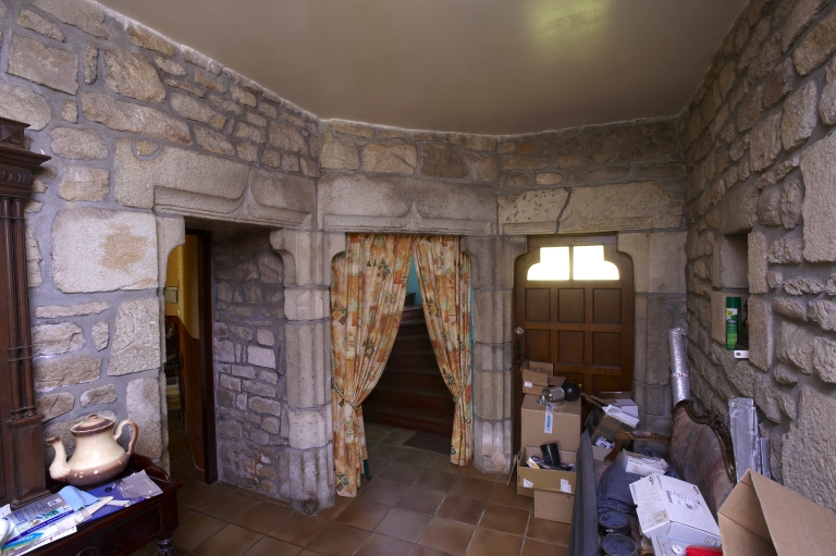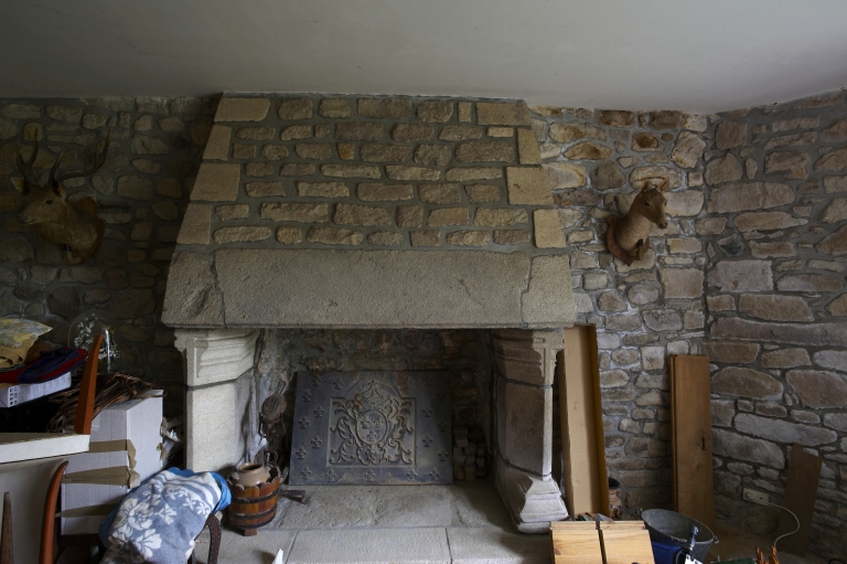 A l'intérieur, la distribution s'organise autour d'un vestibule limité par deux murs de refend. Celui de l'ouest, qui séparait au rez-de-chaussée, la salle de la cuisine, est d´origine ; celui à l'est qui réduit le volume initial de la salle basse, est une adjonction postérieure, probablement du 18e siècle. Au fond du vestibule, trois portes à linteau sur corbelet (fig. 18), caractéristiques du 15e siècle, dont l'un orné d'une fleur de lys, desservent successivement trois pièces : la cuisine, à l'ouest, une tour d'escalier, au nord-ouest et un cellier au nord, aujourd'hui disparu. La cuisine est pourvue sur son mur ouest, d'une cheminée entièrement remontée aux piédroits largement chanfreinés (fig. 19). La salle basse est chauffée par une cheminée, sur son mur est, mais les piédroits ont été remplacés par ceux d'une cheminée d'étage (fig. 20).