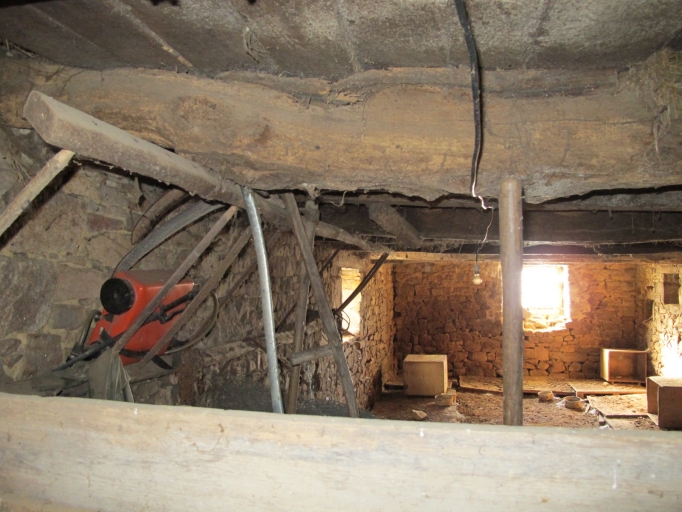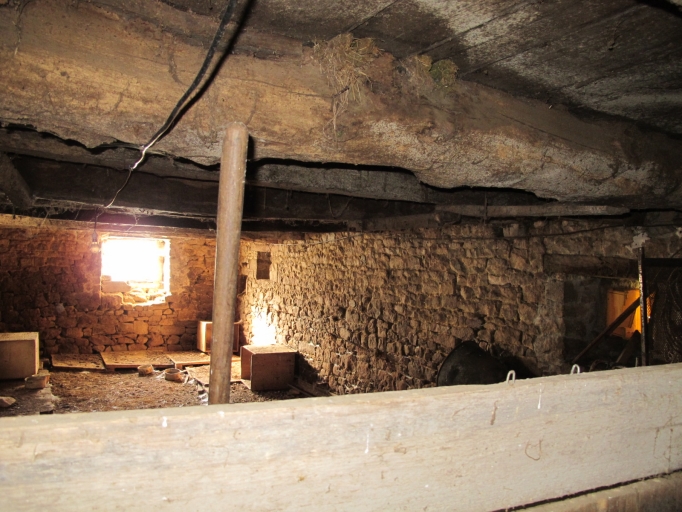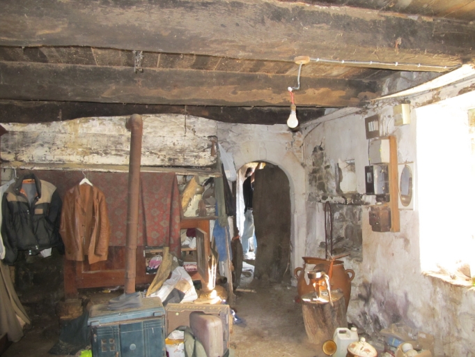 L'absence de comble à surcroît plaide en faveur d'une date ancienne (17e siècle), confirmée par les formes des ouvertures mais cependant mise en doute par l'une des cheminées à linteau de bois, sans doute du 18e siècle : la présence de deux cheminées dans un espace assez restreint semble indiquer une évolution des fonctions ; la salle occupant d'abord la partie ouest proche de l'étable, puis, au 18e siècle l'est avec la présence d'un évier mural ; cependant, et quoique les deux fenêtres corroborent cette hypothèse (seule la fenêtre côté ouest est chanfreinée), aucune reprise dans le mur sud ne vient confirmer un allongement de la salle. Bien que la salle soit dépourvue d'un accès indépendant, les bêtes et les humains n'empruntaient pas le même accès, grâce à la présence du couloir le séparant de l'étable et de la porte spécifique pour le bétail : la salle devait donc rester relativement propre.
