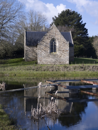 La chapelle en moellon et aujourd'hui couverte en ardoise a été reconstruite selon son plan d'origine, en croix latine, sur la base des anciens murs ; le dallage a été restitué. Cependant, les anciennes prises de vue montrent un édifice enduit contrairement à aujourd'hui. Les ouvertures sont en place, cependant, si la porte ouest à archivolte semble identique à celle d'origine, certaines fenêtres semblent modifiées : ainsi le remplage de la fenêtre du bras sud. Les rampants des pignons, en fort retrait sur une assise marquée sur les photos anciennes ne semblent pas restitués. A l'intérieur, le banc court le long de la nef et des bras de transept. Les piles polygonales à base et chapiteaux moulurés qui marquent la limite du transept et du chœur se terminent abuptement au niveau de la toiture. La charpente en partie remployée montrent trois fermes à poinçon polygonal bagué et arbalétriers à liens courbes : elles ne sont pas visibles sur la photo du chancel prise vers 1940 ; ce dernier séparait la nef du transept et du chœur. Le clocheton est une invention moderne.