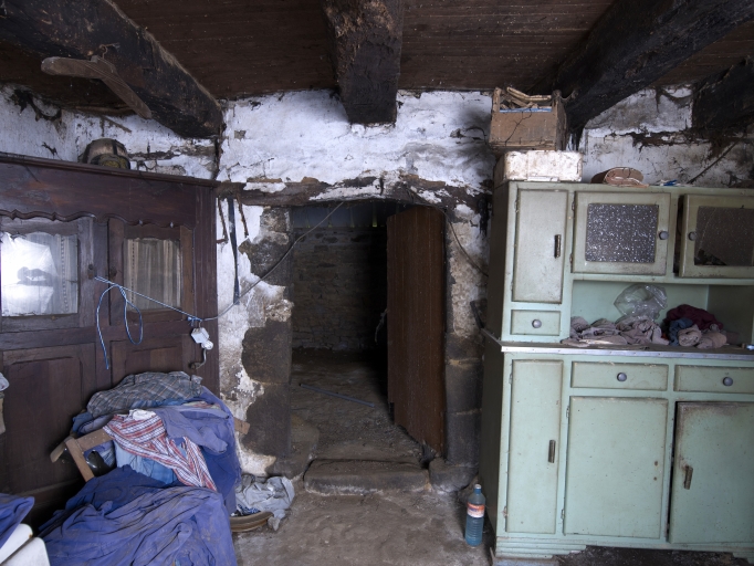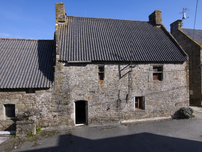 La salle est éclairée d'une fenêtre du 19e siècle. La cheminée sur le refends, à consolesde granite en grossier quart de rond et piédroits simples a perdu son linteau : seuls subsistent les sommiers. A proximité de la porte en plein cintre, une petite armoire murale à une seule étagère. Le plafond, à poutres rapprochées, est isolée du grenier par un hourdi de barasseaux ou quenouilles. Il n'existe plus de séparation entre la salle et l'étable, les deux pièces ayant depuis longtemps la même fonction d'étable. La seconde porte, celle de l'ancienne étable, est placée après le volume de l'écurie perpendiculaire au bâtiment principal. Les piédroits du jour de l'étable sont remployés du 16e siècle. Les poutres de l'étable sont en partie remplacées par des poutrelles d'acier. Une porte a été bouchée dans l'élévation postérieure. Le chaume de la toiture de ce logis étable était protégé par un larmier de pierres plates épousant la forme du toit, comme on en retrouve dans certaines fermes anciennes associant deux logis de différentes hauteurs à Kervignac (Kerguéné), Merlevenez (Lesteno) ou Plouhinec (Porh Berringue, Kermorin, Magouero).