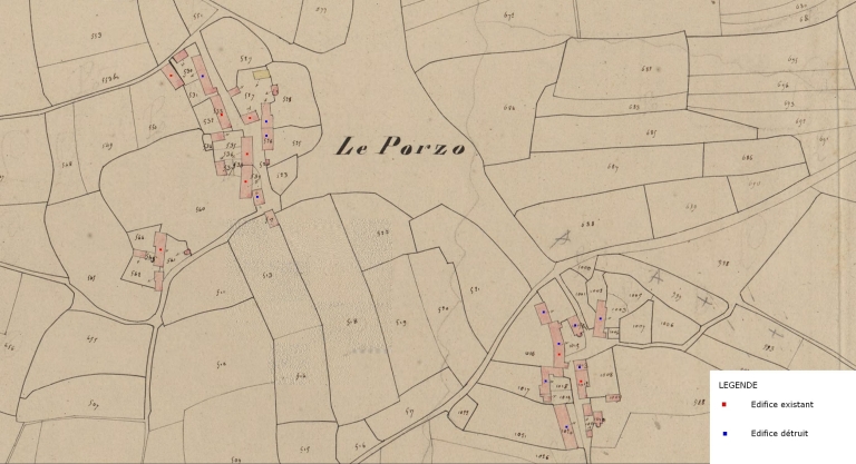 La comparaison entre les deux plans cadastraux de 1837 et actuel fait apparaître de grandes différences. En 1837, si les deux parties du village, complétés par une ferme isolée au nord, sont bien différenciées, leur structure est presque identique, formée de de grandes fermes en alignement discontinu orientées au sud le long du chemin de desserte, complétées d'une ou deux fermes au sud du chemin. A la faveur des reconstructions du 19e siècle, cette structure originale est moins sensible aujourd'hui en particulier au Bas-Porzo. Le Haut Porzo conserve un alignement (parcelle 176) composé d'un logis du début du 17e siècle. A l'est, un second logis-étable en alignement formant une autre propriété en 1837 est construit peu avant cette date, ou reconstruit peu après.
