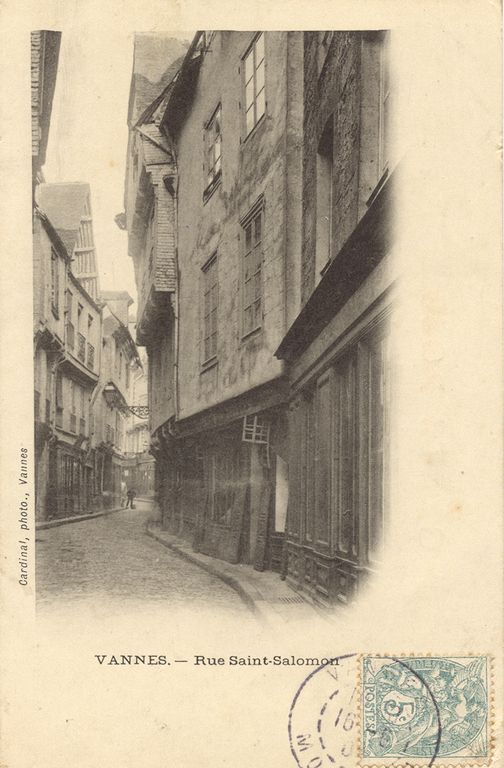 A. D. Morbihan 6E 24 : 29 juillet 1760 : vente passée entre le Sr Pierre Moisan clerc praticien demeurant en cette ville rue des Vierges paroisse Saint-Pierre faisant pour haut et puissant messire Marie Jacques du Bahuno chevalier marquis du Liscoët demeurant à son château du Bois de la Roche paroisse de Coadont évêché de Dol aux enclaves de celui de Tréguier au Sr François Brunet marchand et Dlle Marie Jeanne Quennec son épouse demeurant rue Saint Salomon paroisse Saint Pierre, d´une maison située en la dite rue Saint Salomon actuellement affermée au Sr Gobaitte traiteur avec toutes ses appartenances et dépendances pour et en faveur de la somme de 3500 £.