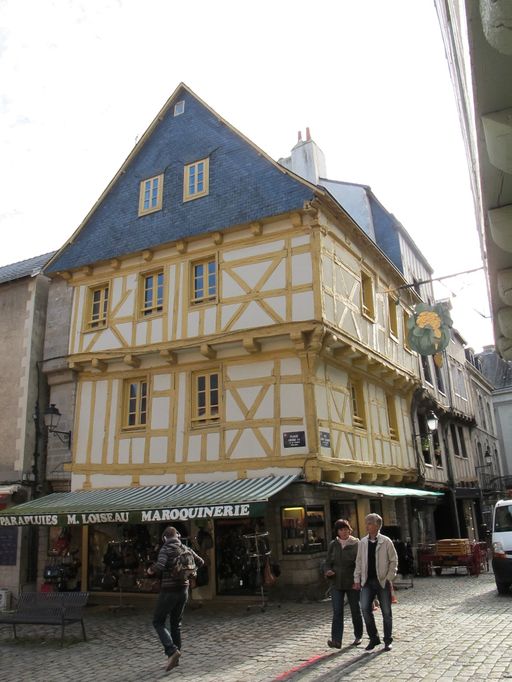 Maison en pan de bois dont les caractéristiques architecturales, charpente de façade, galandage de l'encorbellement, font remonter l'édifice au 15e siècle. La maison est déclarée dans le rentier de 1455 comme appartenant à Jehan Duval, après avoir appartenu à Perrot Lorfebvre. Lors de la réformation en 1677, la maison appartient à Claude Le Moine, avocat. La maison est vendue en 1786 à Pierre Egu, marchand dont la fille ou la petite fille est toujours propriétaire en 1844 dans les matrices cadastrales. Cette dernière fait une demande de travaux le 1er septembre 1840 pour "latter" les poutres en encorbellement de sa maison et faire blanchir ainsi que crépir "sa façade de maison dans sa partie supérieure à partir du rez-de-chaussée". Seul le blanchiment au simple lait de chaux de la partie supérieure de la bâtisse est autorisé par l'architecte. Défense lui était faite de crépir et latter les extrémités des poutres de sa maison "attendu que ce lattis tendait à prolonger la durée des poutres destinées à porter les encorbellements interdits par l'art. 104 du réglement de police de la ville de Vannes". On remarque que le mur latéral gauche sur la place Henri IV est en contradiction avec la charpente. Il est d'après A. Dégez de taille et de style de la deuxième moitié du 16e siècle alors que la maison peut remonter au 15e siècle. Ce mur a sans doute été remonté ou créé après la construction de la maison. Les poteaux qui encadraient les fenêtres ont gardé la trace de décor qui apparaît sur le poteau d'angle et qui est constitué d'une colonnette engagée avec une base moulurée. Taillées dans la masse du poteau, ces sculptures ont été buchées. Ce décor, unique et très rare à Vannes peut remonter à la première moitié du 15e siècle. Dans la deuxième moitié du 20e siècle, la maison a fait l'objet de restaurations qui ont fait disparaître beaucoup d'éléments anciens.