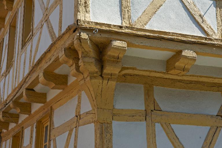 Grande maison en pan de bois avec encorbellement à plan double en profondeur sur poutres construite en alignement de rue sur une parcelle d'angle de la place Henri IV. Logis à pignon sur rue qui montre sur un soubassement de pierre deux étages carrés et un étage de comble avec sous-sol. La charpente de façade est formée de croix de Saint-André qui ne sont pas aux extrémités mais décalées d'une travée, permettant ainsi l'ouverture d'une fenêtre. Les têtes de poutres sont moulurées en quart de rond repris en contre moulure. L'encorbellement d'angle est souligné par 3 consoles, une pour le coyer et deux pour le prolongement des sablières. L'escalier est latéral postérieur dont l'accès est situé en façade nord.