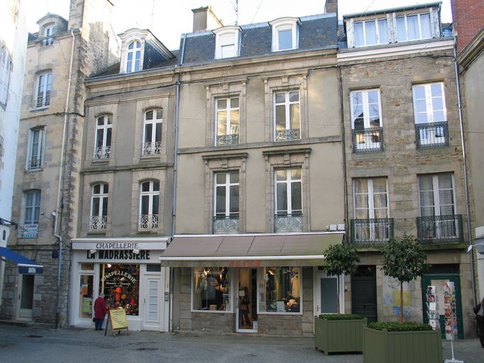 Immeuble reconstruit en 1883 pour Louis-François Le Roux d'après les matrices cadastrales des propriétés bâties entre 1882 et 1909 sur l'emplacement d'une maison ancienne adossée au mur de l'enceinte et dont l'emprise est visible sur le plan cadastral de 1807 au nord-est de l'ancien Marché au seigle. En 1846, avant la reconstruction de l'immeuble, Louis-François Le Roux, menuisier, avait déjà sollicité la ville pour avoir l'autorisation d'accroître les ouvertures de sa première maison et de refaire son colombage. Les travaux demandés avaient été autorisés mais à condition de suivre le nouvel alignement ; cette décision, contestée par le propriétaire qui voulait avant tout conserver pour sa maison des dimensions suffisantes, a vraisemblablement incité ce dernier à la reconstruire quelques années plus tard. Afin de conserver l'alignement existant, seules seront demandées et accordées la devanture d'applicage, la suppression de l'étal existant et l'agrandissement des ouvertures des étages supérieurs.