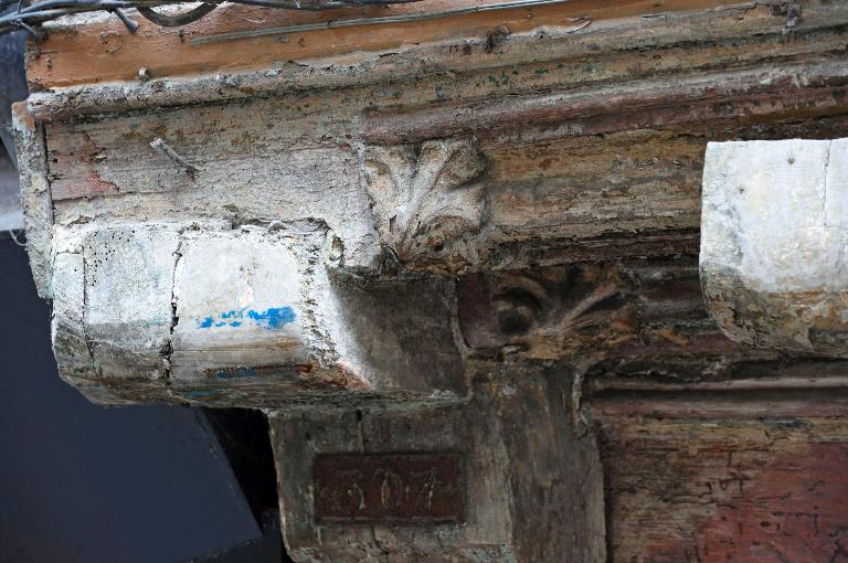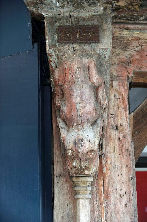 Mouluration de la sablière basse de l'étage et de l'entretoise est constituée par une alternance de boudins et de nervures avec congé en beau feuillage sculpté. Les consoles des poteaux représentent des animaux.