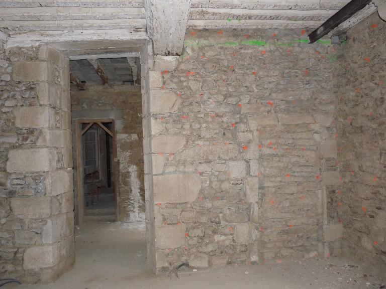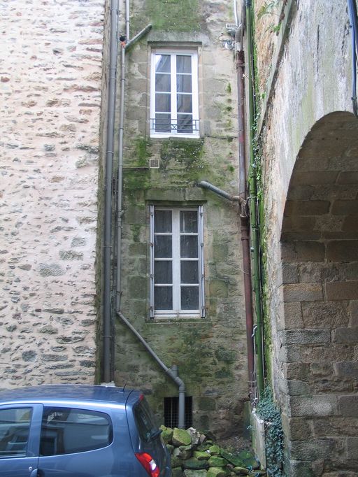Les pièces avec les planchers à la française et les cheminées correspondent bien au 17e siècle. Cependant, il n'est pas certain que l'escalier aujourd'hui emprunté était celui qui desservait ces pièces à l'époque. En 1687, le partage en deux "lotties" égales de cet hôtel entre Hierosme de Quintin, seigneur de Saint-Denac et Gratien Josset, sieur de Kervillart, héritier de Damien Bonfils, décrit l'édifice de la façon suivante : une cave au-dessous de la chambre basse de devant sur la rue au niveau du rez-de-chaussée, surmontée de deux chambres au-dessus et d'un grenier ; au-derrière une grande cave, une cuisine sur cour surmontée de deux chambres et d'un grenier. Cette division de propriété de la maison au niveau des étages (rez-de-chaussée avec premier étage et une partie de cave puis deuxième étage avec greniers et autre partie de cave) explique peut-être la situation de l'escalier actuel sous appentis en façade nord de l'hôtel qui n'est pas l'escalier d'origine et qui aurait été rejeté à cet endroit pour faciliter l'indépendance des deux logements. Le coup de sabre en façade sur la cour intérieure du corps de l'escalier, le type de balustres utilisées plutôt de la fin du 17e siècle-debut 18e siècle (même si certaines d'entre elles ont été remplacées), les ouvertures sur palier plus tardives ainsi que le mur est de la cage où l'on distingue d'anciennes ouvertures bouchées renforcent cette hypothèse. Le passage situé entre le corps sur rue et le corps arrière est peut-être l'emplacement de l'escalier d'origine, modifié en tout cas par la suite. Le mur extérieur correspondant à ce passage façade ouest de l'hôtel donnant sur la cour intérieure de l'hôtel du Faouédic montre de l'intérieur qu'il a été visiblement plaqué en retrait de la façade pour fermer ce passage. La place de l'escalier d'origine reste à confirmer.