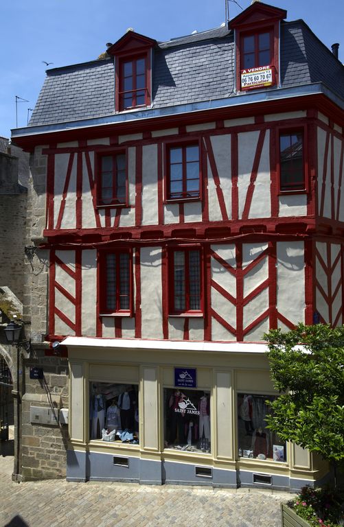 Au milieu du 15e siècle, une maison qui appartient à Jehan Guillemot est signalée à cet emplacement dans le rentier de 1455. Faute de n'avoir pu la visiter entièrement, on ne sait si cette maison dont l'essentiel de la construction remonte au 16e siècle, conserve des éléments de la maison signalée dans le rentier. Les archives de la réformation du domaine en 1677 mentionne cette maison comme appartenant à Jacquette Poury veuve de Jacques Pournin sieur de la Forest et maître-apothicaire qui l'a acquise auprès du sieur Laurens Mersant marchand le 6 octobre 1655. Des vestiges du soubassement ancien comme un pilastre et la mouluration des fenêtres sont encore visibles et pourraient correspondre à cette période. En 1698, une partie de la maison est louée en boutique à un maître-pâtissier et traiteur. En 1723, le quart de la maison est vendu, puis la totalité en 1728 aux mêmes acquéreurs. La maison est revendue par la suite à Marie Le Mezec et Patern Le Roux. Les contrats de location mentionnent 2 caves, une chambre basse ou salon, une cuisine pourvue d'armoires d'attache, 2 chambres hautes au 1er étage, galerie à côté (présence de vestiges), 2 chambres hautes au second étage, grenier et pavillon. Un cabinet à l'impérial est également indiqué dans un des premiers contrats (1703). Litige en 1782 entre le propriétaire du château Gaillard et celui de cette maison (Jean-Jacques Brunet, apothicaire) à propos des fosses des latrines dont les matières débordent. En 1864, les propriétaires de la maison (les soeurs Tanguy) entreprennent des transformations importantes : mise en place d'une devanture de magasin en menuiserie sur les deux façades, déplacement rue des Halles de la porte d'entrée située initialement rue Noé, exhaussement de la maison de deux étages sous réserve de supprimer les encorbellements existants (?), réalisation de deux grandes croisées sur les deux façades et modification des ardoises rue Noé, de la toiture rue des Halles et du système de charpente pour installer des mansardes dans les greniers.