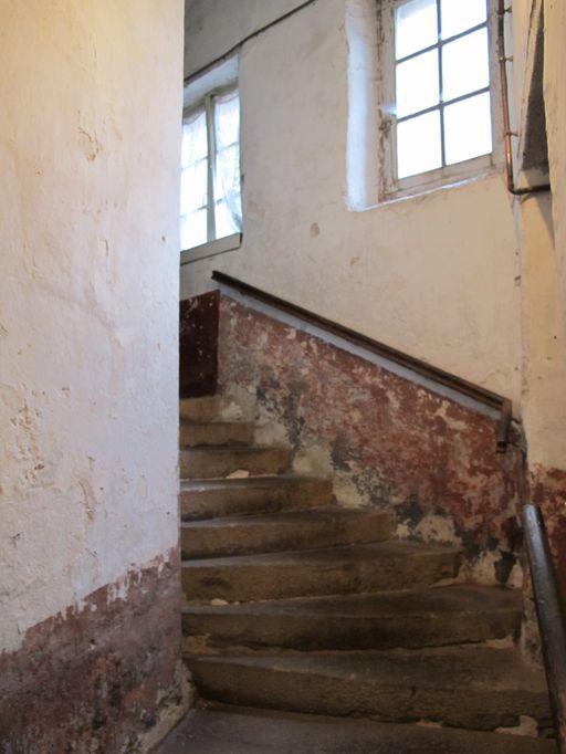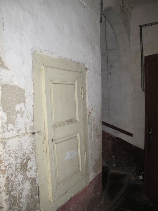 La porte au sud dans la cage d'esclier est sans doute l'accès à ce qui est donné comme "un caveau" sur le procès-verbal d'estimation de 1790, placé sous la cage d'escalier. Le P-V décrit en effet le rez-de-chaussée avec "cuisine, cage d'escalier, caveau, sallon, et cave sous terre". Cette description ne justifie pas l'existence de l'aile en retour sur la rue des Vierges qui cependant existe sur le plan cadastral de 1809, sur la même parcelle.