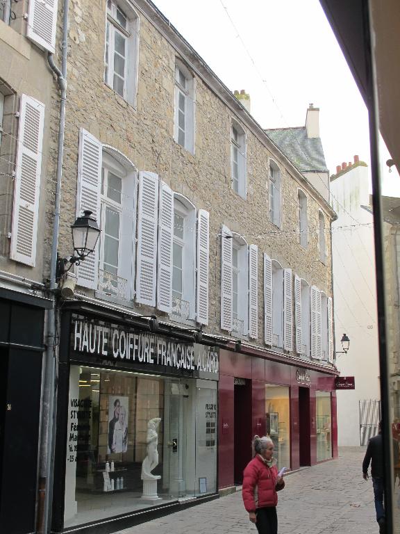 Immeuble édifié à la fin du 18e siècle d'après le type d'encadrements des fenêtres, sur l'emplacement d'un édifice plus ancien mentionné dans les archives de la réformation et appartenant à Jean Le Bideau prêtre recteur de Porspoden et chapelain de la chapellenie de Saint Fiacre de service en la cathédrale de Vannes. L'immeuble, visible sur le plan cadastral de 1844, comporte en façade postérieure une travée latérale, côté sud en retrait. Par contre la cour postérieure ne comprend pas encore de dépendances. Les matrices cadastrales des propriétés bâties entre 1882 et 1909 indique pour 1882 la transformation de l'écurie de l'immeuble en magasin par Jacques Combes, marchand de draps et propriétaire de l'immeuble à cette époque. Dès 1845, ce dernier était autorisé déjà à pratiquer des ouvertures et mettre une devanture. La façade sur rue a été désenduite. L'accès aux étages de cet immeuble a été modifié et se fait aujourd'hui par l'escalier du n°28.