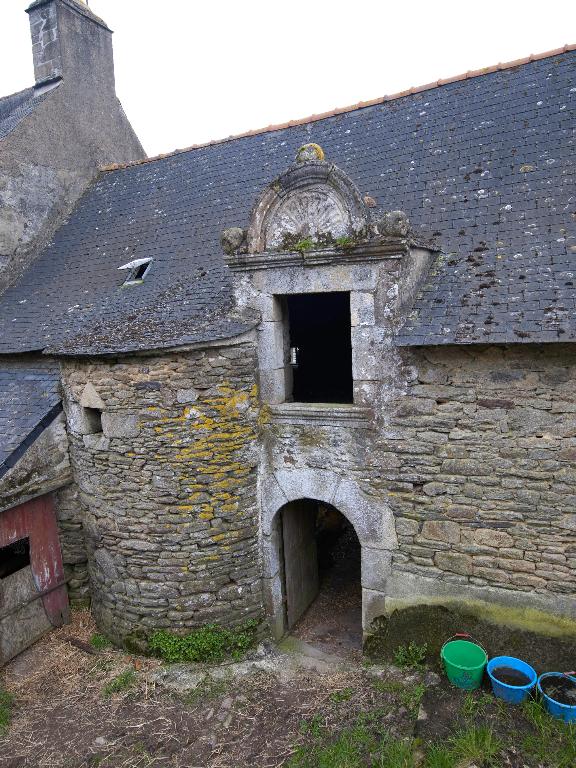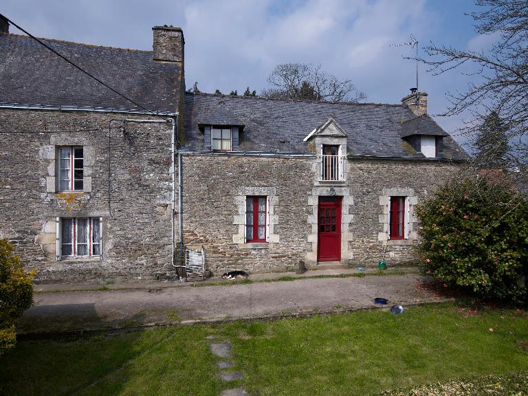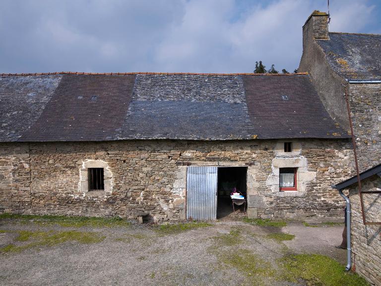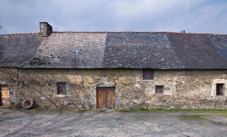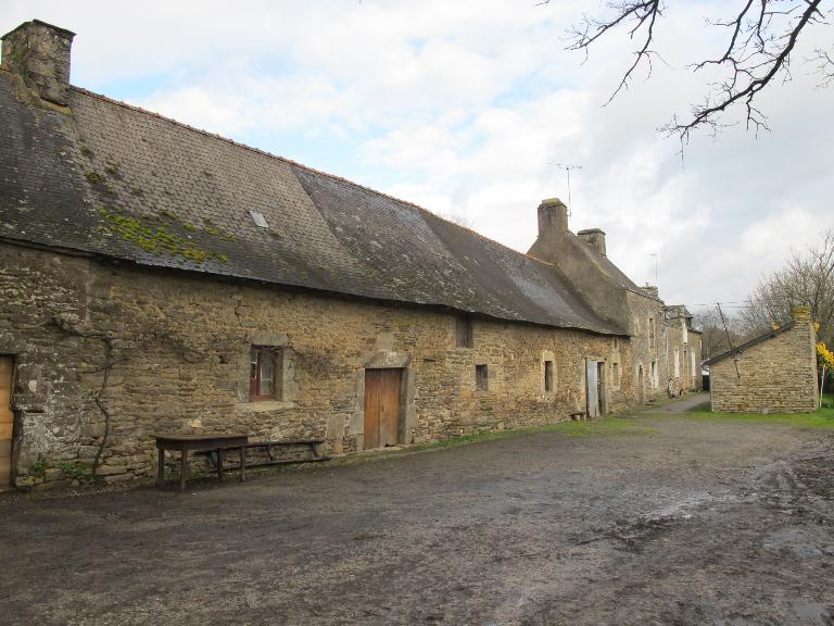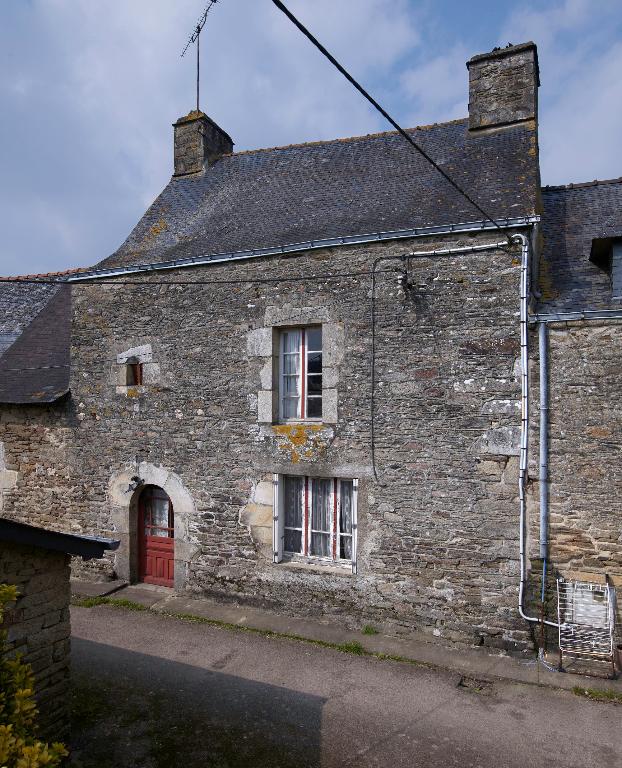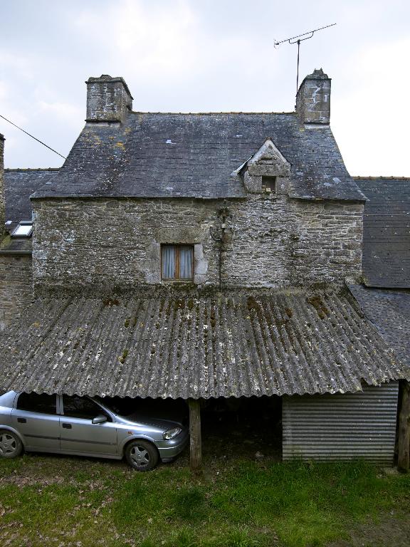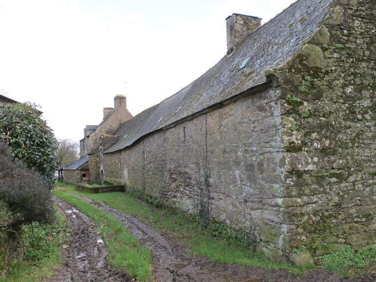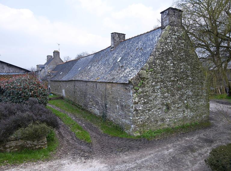 L’existence de logis en alignement déclassés en dépendance est un phénomène récurrent. Cependant, même si elles ont subi quelques modifications, les différentes parties sont ici bien lisibles : il s'agit tout d'abord du modèle connu associant un logis à étage à un logis-étable bas ; l'absence de reprise nette les deux parties prouve que leur construction est contemporaine, effectuée d'après les inscriptions autour de 1650 par G. Ollivier, un laboureur visiblement prospère. La présence d'inscriptions et de dates, pour certaines remployées, renseignent sur les modifications successives de la ferme. Bien qu'il s'agisse certainement d'un remploi, la lucarne Renaissance donnant sur la rue est un élément particulièrement intéressant, car hormis celles visibles au bourg, seule une autre ouverture de ce type a été observée sur la dépendance d'un ancien manoir du 18e siècle, à Coët-Daly.