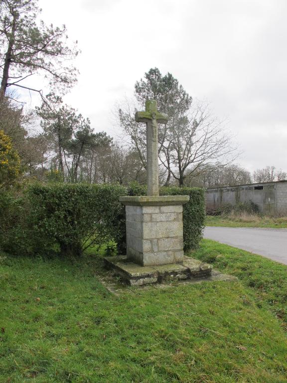 Croix de granite composée d'un emmarchement à deux degrés, soubassement en pierre de taille et table monolithe. La croix monolithe, à fût chanfreiné et à bras courts, est ornée d'un Christ en croix.