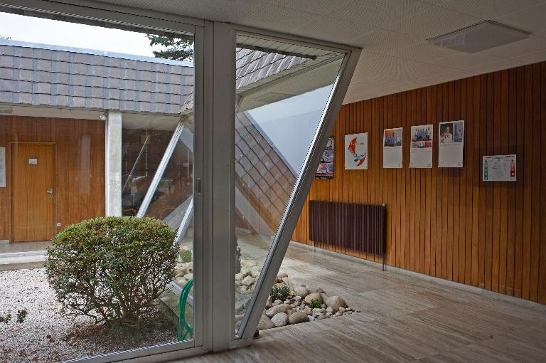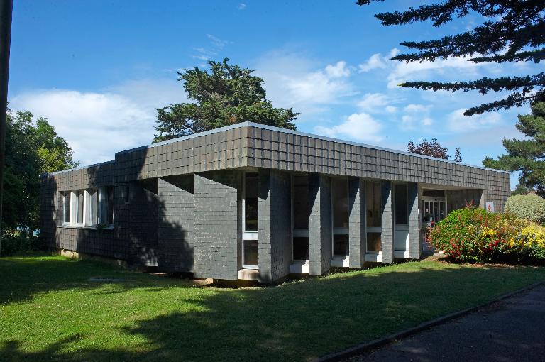Bâtiment enseignement : composé sur une trame de 1,80 m et un plan carré dont le côté est se prolonge en deux ailes saillantes, il s’élève sur un seul niveau en rez-de-chaussée et est couvert d’un toit terrasse. Il est intégralement bardé d’ardoises.. Afin de répondre à une volonté d’intégration au site, la façade est très découpée. La façade est, où se situe l’entrée principale, est généreusement vitrée. Elle est, au niveau de la salle de réunion au nord, accidentée de redans dont les faces sud sont vitrées. Elle comporte également des portes fenêtres et des baies carrées disposées en bandeaux. L’entrée donne sur un vaste espace de transition, un hall d’accueil considéré comme un lieu de réception et donc délibérément dégagé des servitudes de vestiaires et groupes sanitaires. Ce hall permet l’accès au patio central ceint d’une circulation intérieure qui distribue les pièces et se prolonge vers le nord par une antenne ouvrant des jours et des vues inattendues. Le patio est décoré d’une œuvre réalisée par le sculpteur Francis Pellerin. Le bâtiment comprend deux bureaux, une salle de réunion et une salle de tirage dans l’aile nord-est, deux salles de bibliothèque et une salle de tirage dans l’aile sud-est, des salles d’audiovisuel et des sanitaires côté sud, une salle de classe de plus de 20 m de long côté ouest et deux autres côté nord. Un amphithéâtre, prévu à l'origine, n'a pas été réalisé.